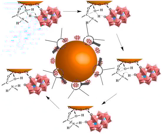 The catalytic mechanism of CeONP@POMs. The brown sphere represents the CeONP core, the pink structures indicate the POMs coating on the surface. and the arrow denotes the hydrolytic degradation process [60].