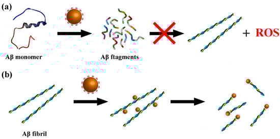 Scheme of CeONP@POMD as hydrolytic enzyme to degrade Abβ40 monomers (a) and Aβ40 fibrils (b). Brown particles represent the CeONP@POMD core (see Figure 12 caption for details), while the other structures in different colors represent Aβ monomers, Aβ fibrils, and their degradation fragments. Arrows indicate the hydrolytic degradation process [60].