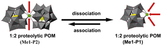 1:2 proteolytic POM (Me1-P2; Me = metal, P = POM) hydrolysis may dissociate into 1:1 proteolytic POM (Me1-P1). Me1-P2 consists of one hydrolytically active metal (green sphere, Me1) and two Keggin-type POMs (addenda atoms are depicted as gray polyhedra, oxygen atoms as small red spheres, and the incorporated heteroatoms as yellow polyhedra), and can dissociate into Me1-K1 under specific conditions, potentially reassociating. In Me1-P2, the active metal is shielded, resulting in low hydrolytic activity, whereas after dissociation into Me1-P1, the metal is exposed and hydrolytic activity is enhanced [105].