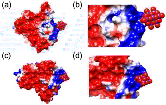 MD simulation of interactions of S100 calcium-binding protein A9 with POMs. (a,c) Binding of Nb10 and TiNb9, respectively, to a subunit of S100A9 dimer. The electrostatic potentials on the protein surface are colored by a red−white−blue gradient with the values spanning from −5.0 to 5.0 kT/e. Nb10 and TiNb9 are shown as van der Waals spheres, where oxygen is presented in red, covering Nb atoms shown in blue and Ti in pink. (b,d) Magnified views of the complex formation of Nb10 and TiNb9, respectively, on the S100A9 surface based on ionic interactions [61].