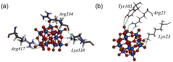 The amino acid environment of [SiW11O39]7− in the most stable binding sites (BS1) at AChE, with closed-form (a) and open form (b) of the enzyme. Amino acid residues Arg21, Lys23, and Tyr105 form new allosteric site termed β-allosteric site (β-AS) [63].