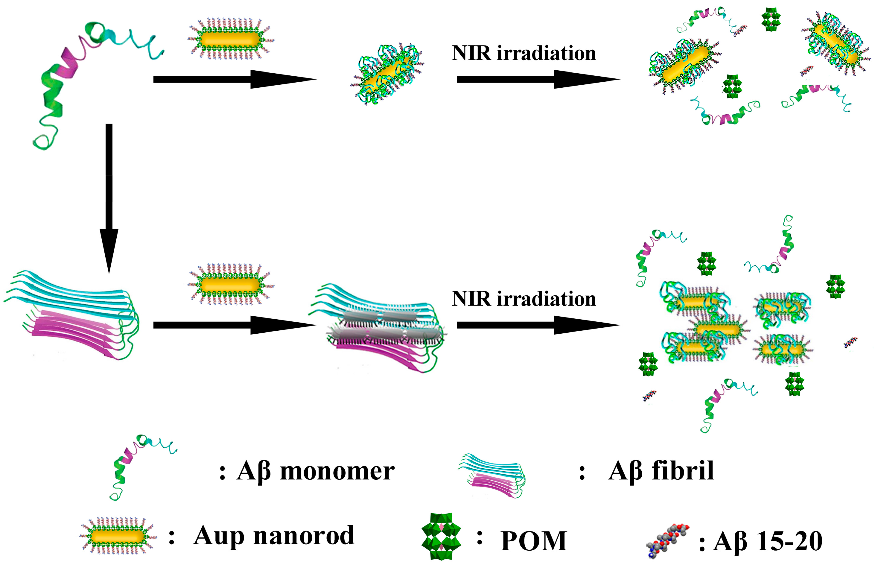 | 18 | Aβ | AuP | Aβ15-20 targeting → POMs/peptide inhibition → NIR photothermal Aβ fibril disassembly | BBB Penetration: 2.097 ± 0.337% (Brain Au accumulation); PC12 viability ↓ ~46% (Aβ 5μM). | [57] | |