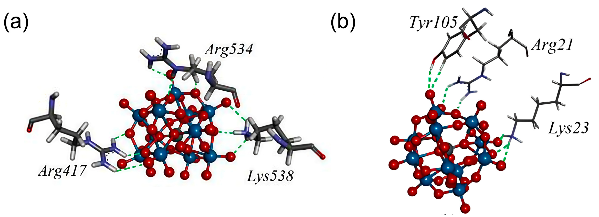 - Paul, T.J.; Parac-Vogt, T.N.; Quiñonero, D.; Prabhakar, R. Investigating Polyoxometalate–Protein Interactions at Chemically Distinct Binding Sites. J. Phys. Chem. B 2018, 122, 7219–7232. [Google Scholar] [CrossRef] [PubMed]
