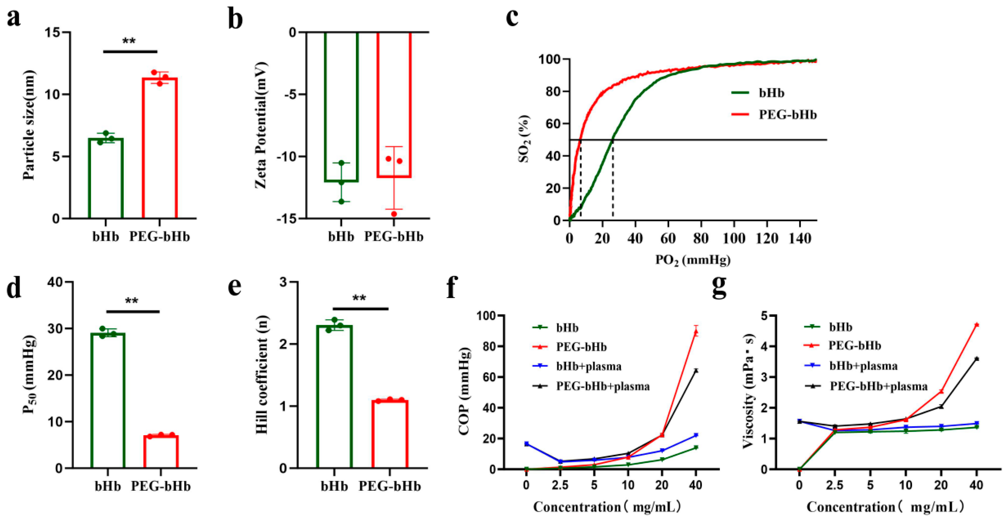 PEG-bHb exhibits distinct physicochemical properties, including an increased hydrodynamic diameter, negative surface charge, high COP, elevated viscosity, and a reduced P