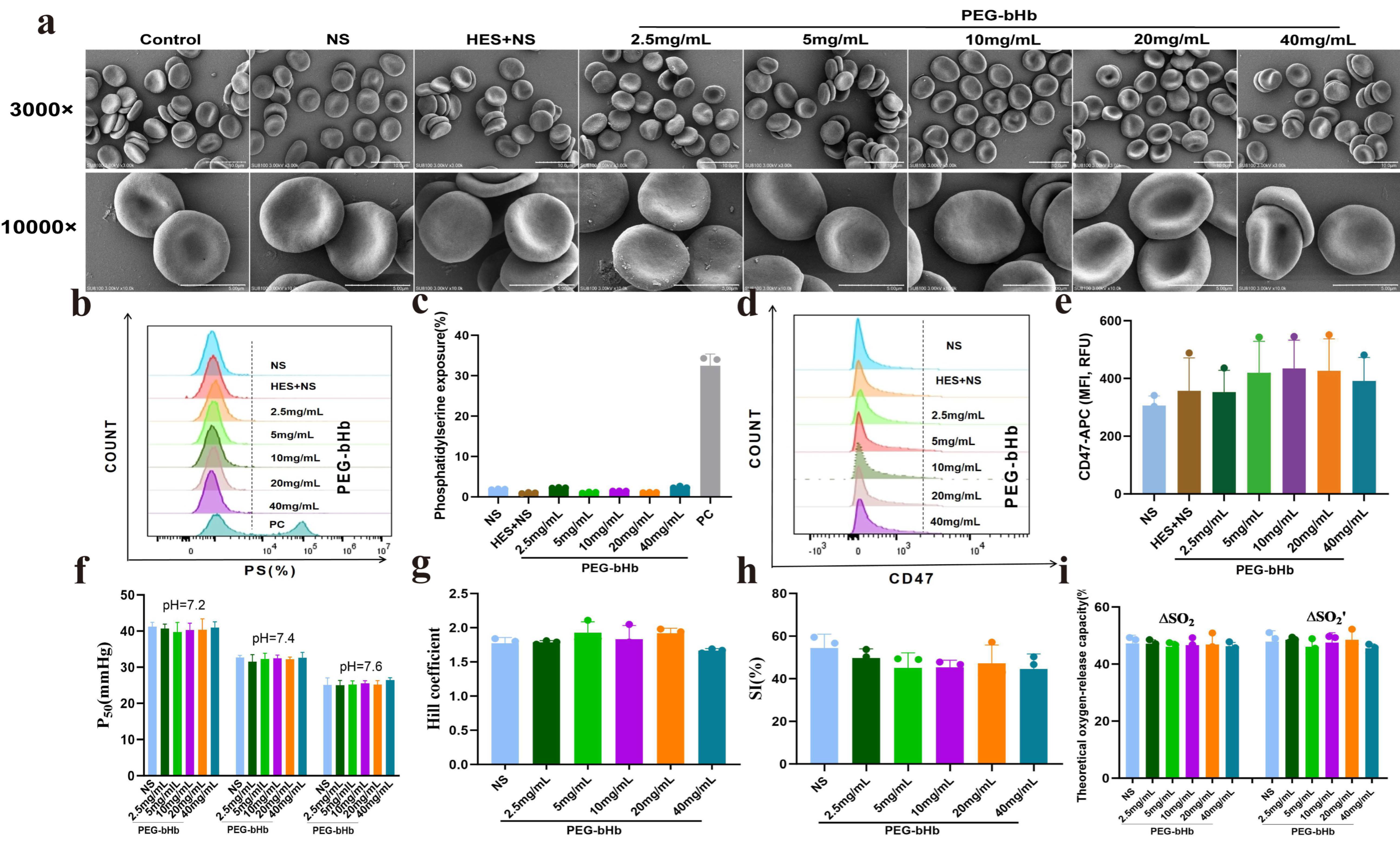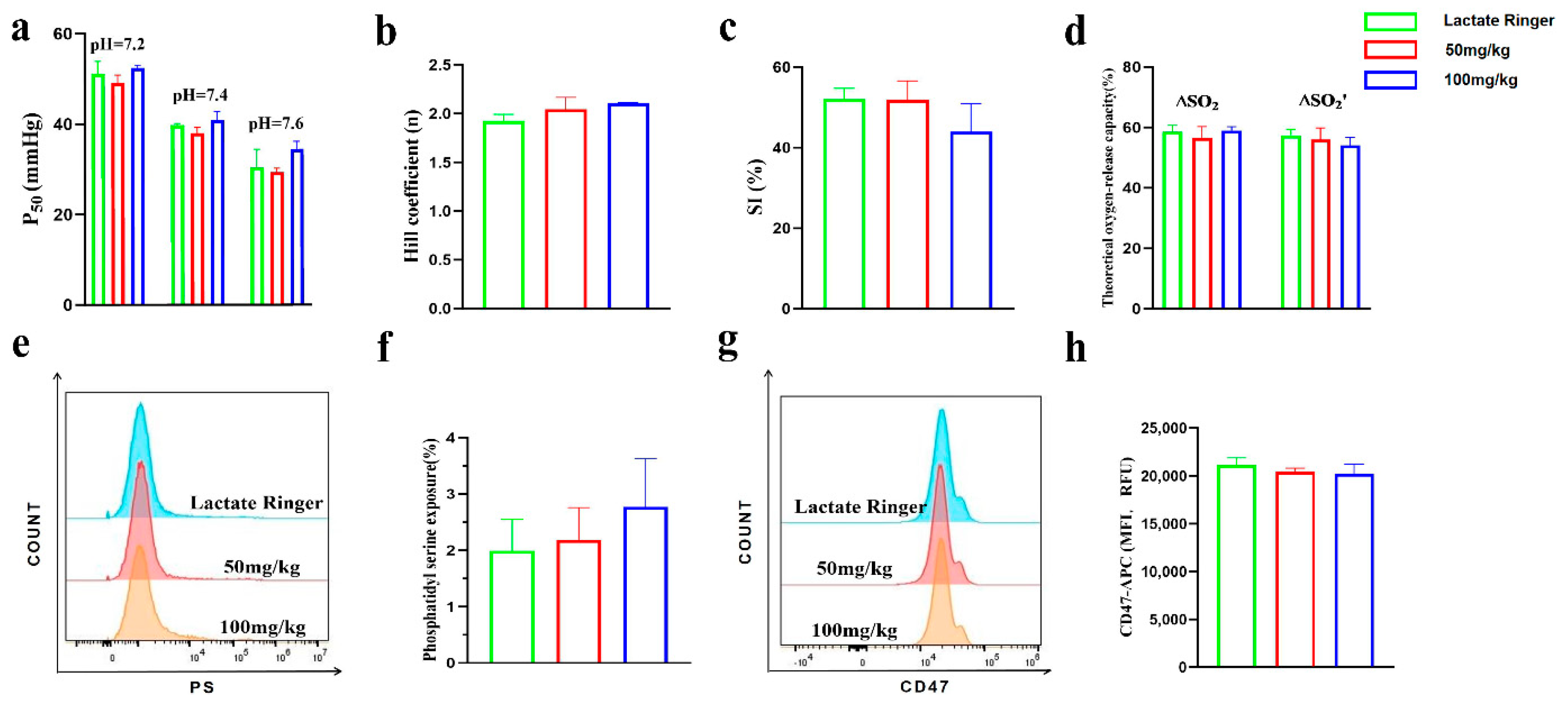 50, Hill coefficient, SI, and theoretical oxygen release capacity. This study comprehensively evaluated the oxygen supply efficiency of PEG-bHb using integrated in vitro and in vivo assays. In vitro, after incubation with PEG-bHb, erythrocytes revealed no significant alterations in P