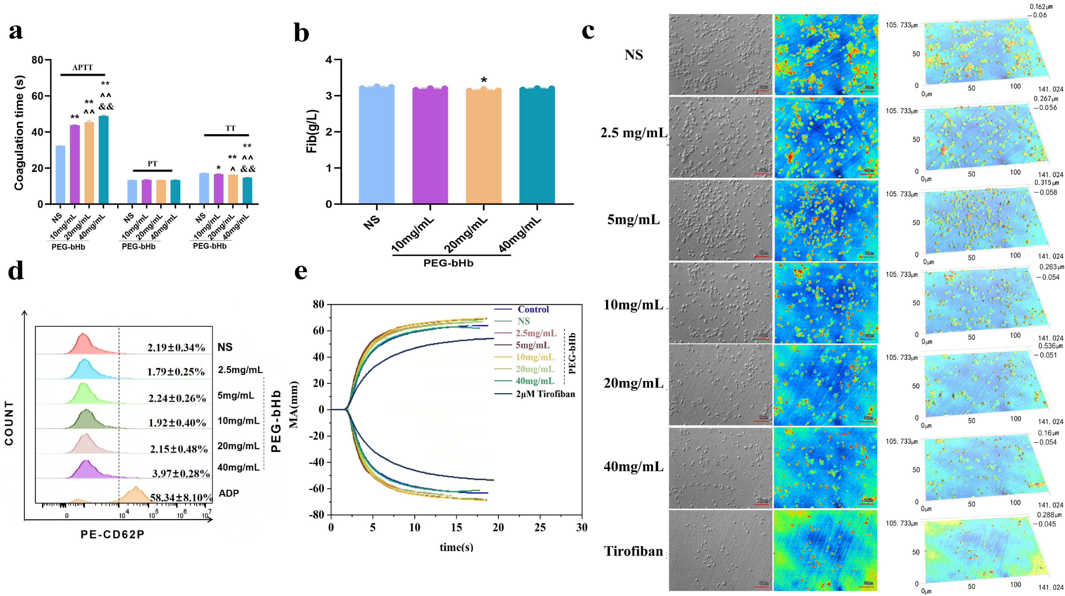 For coagulation parameters (APTT, PT, TT, Fib) assays, PPP was mixed with 10, 20, and 40 mg/mL PEG-bHb in a 9:1 ratio and incubated with shaking at 37 °C for 1 h.