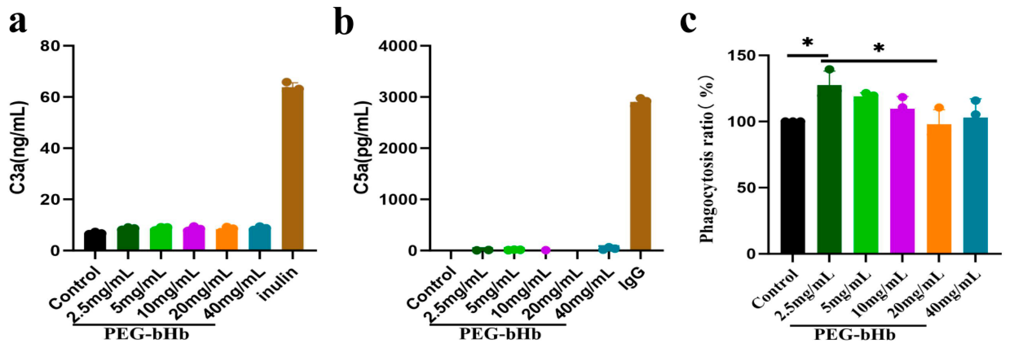 As an exogenous modification material widely used in intravenously administered drugs, the immunogenicity of PEG is a critical factor influencing the clinical translation of biotherapeutics. Immune responses triggered by PEG can not only accelerate drug clearance and shorten half-life but also, more severely, activate the complement system and induce complement activation-related pseudoallergy (CARPA). The post-administration levels of C3a and C5a directly and specifically reflect whether PEG has induced complement activation, thereby providing essential experimental evidence for evaluating the ability of a product to avoid acute immunotoxicities such as CARPA. Therefore, the levels of C3a and C5a are crucial to assess the complement activation potential of PEG-bHb [