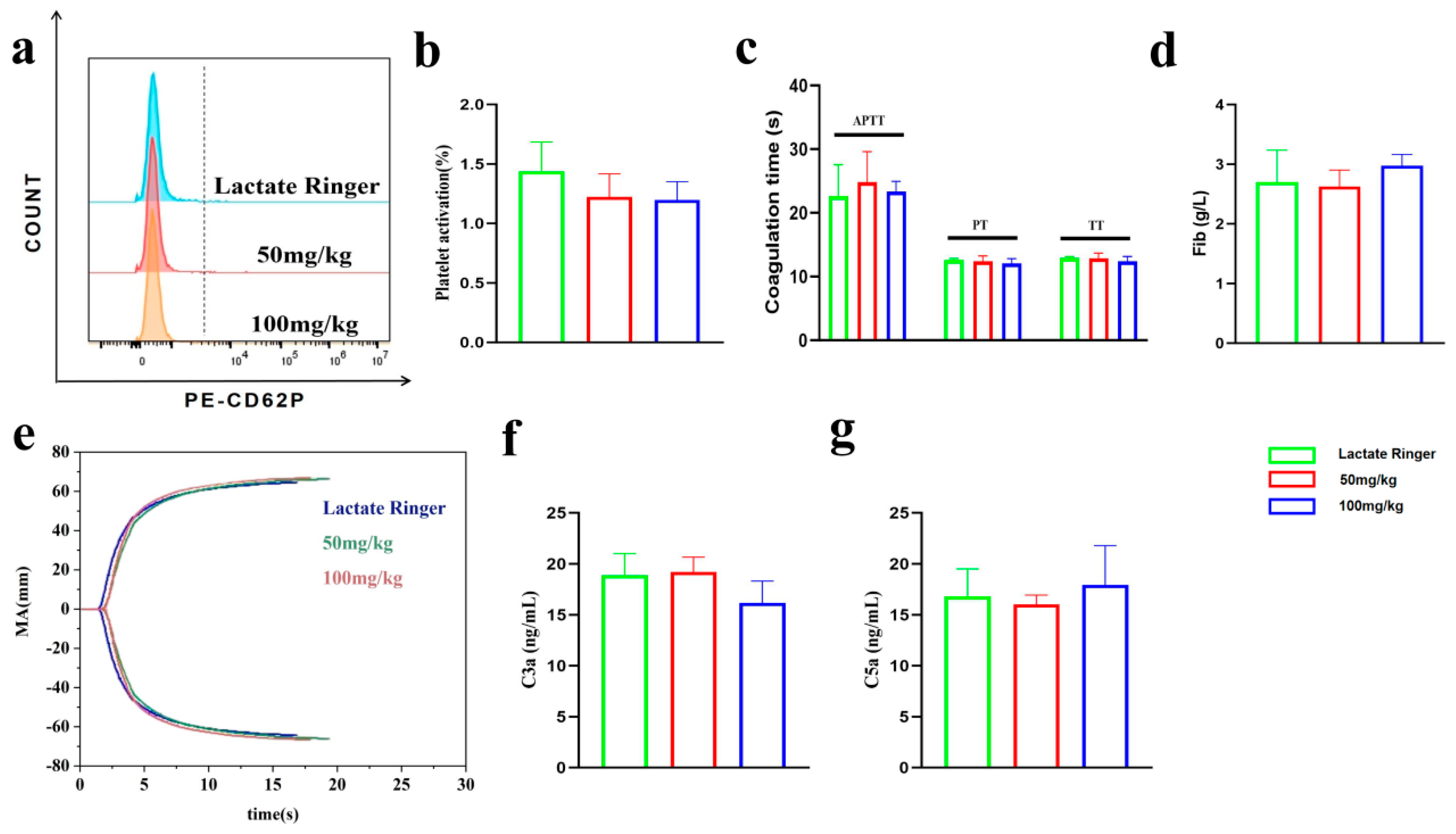 Male Wistar rats (250–280 g, n = 12) were randomly divided into three groups (n = 4 per group). The control group received lactated Ringer’s solution (Qitaidb, Qiqihaer, China) intravenously at a volume of 2.5 mL/kg. The treatment groups received intravenous infusions of PEG-bHb at doses of 50 or 100 mg/kg, at a volume of 2.5 mL/kg. Blood samples were collected from Wistar rats 2 h after infusion and were carried out for the analysis of phosphatidylserine (PS) exposure, CD47, platelet activation. At 24 h post-infusion, whole blood was drawn into heparinized tubes for analysis with the automatic hematology analyzer (Mindray, BC-5000VET, Shenzhen, China) and the blood gas analyzer (Radiometer, ABL90 FIEX, Copenhagen, Denmark), which were also analyzed for APTT, PT, thrombin time (TT), and Fibrinogen (Fib).