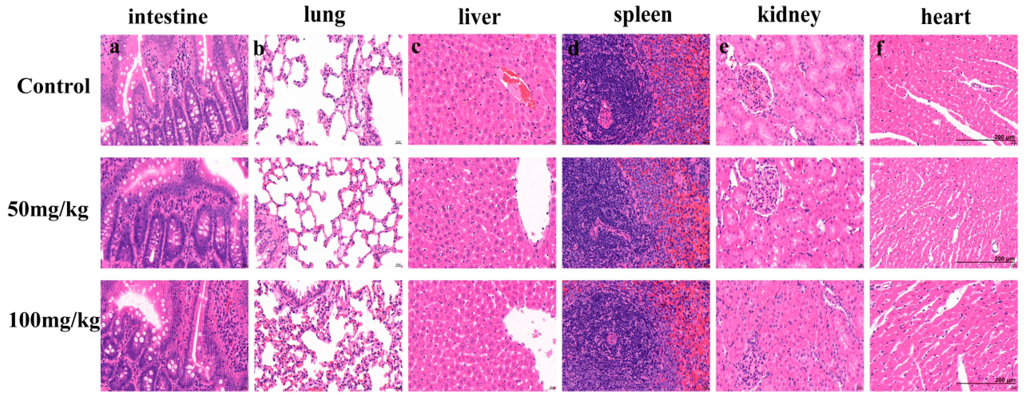 33]. This study demonstrated that 2.5–40 mg/mL PEG-bHb did not significantly affect the levels of complement components C3a and C5a. The concentrations of C3a and C5a were comparable to those in the control group and were substantially lower than those in the PC group (inulin for C3a and IgG for C5a). Furthermore, PEG-bHb administered at 50–100 mg/kg did not increase the concentrations of C3a or C5a in vivo. Critically, preventing complement activation averts vasodilation, increased vascular permeability, and leukocyte chemotaxis, which could significantly exacerbate tissue injury, particularly in vulnerable states such as hemorrhagic shock or trauma. Moreover, the absence of inflammatory cell infiltration in vital organs (intestine, lung, liver, spleen, kidney, and heart) provides additional evidence that PEG-bHb does not provoke systemic inflammation, consistent with the lack of complement activation observed in this study.