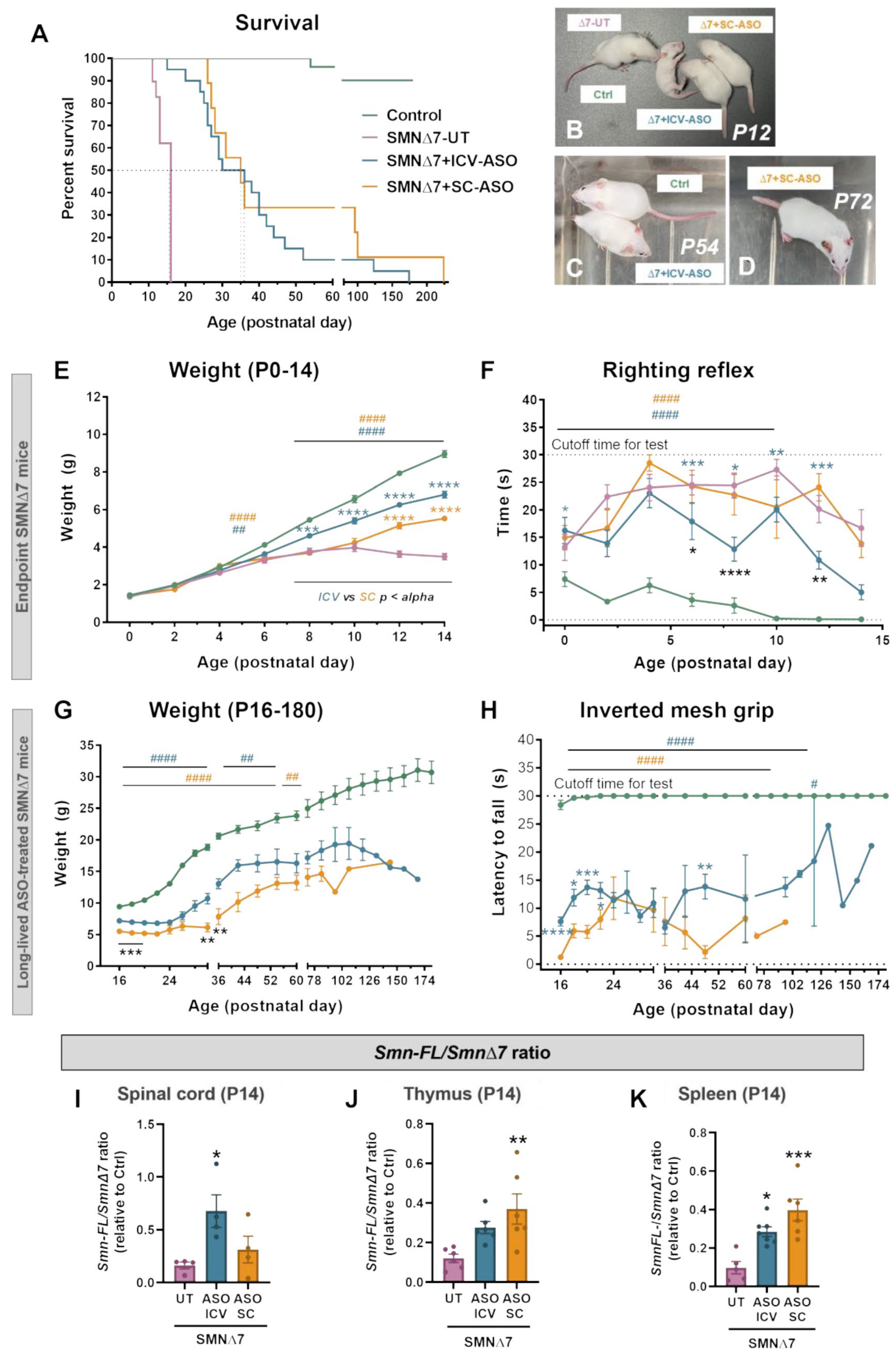2.1. Central or Systemic Delivery of SMN-ASO Improves Disease Outcome in SMA Mice