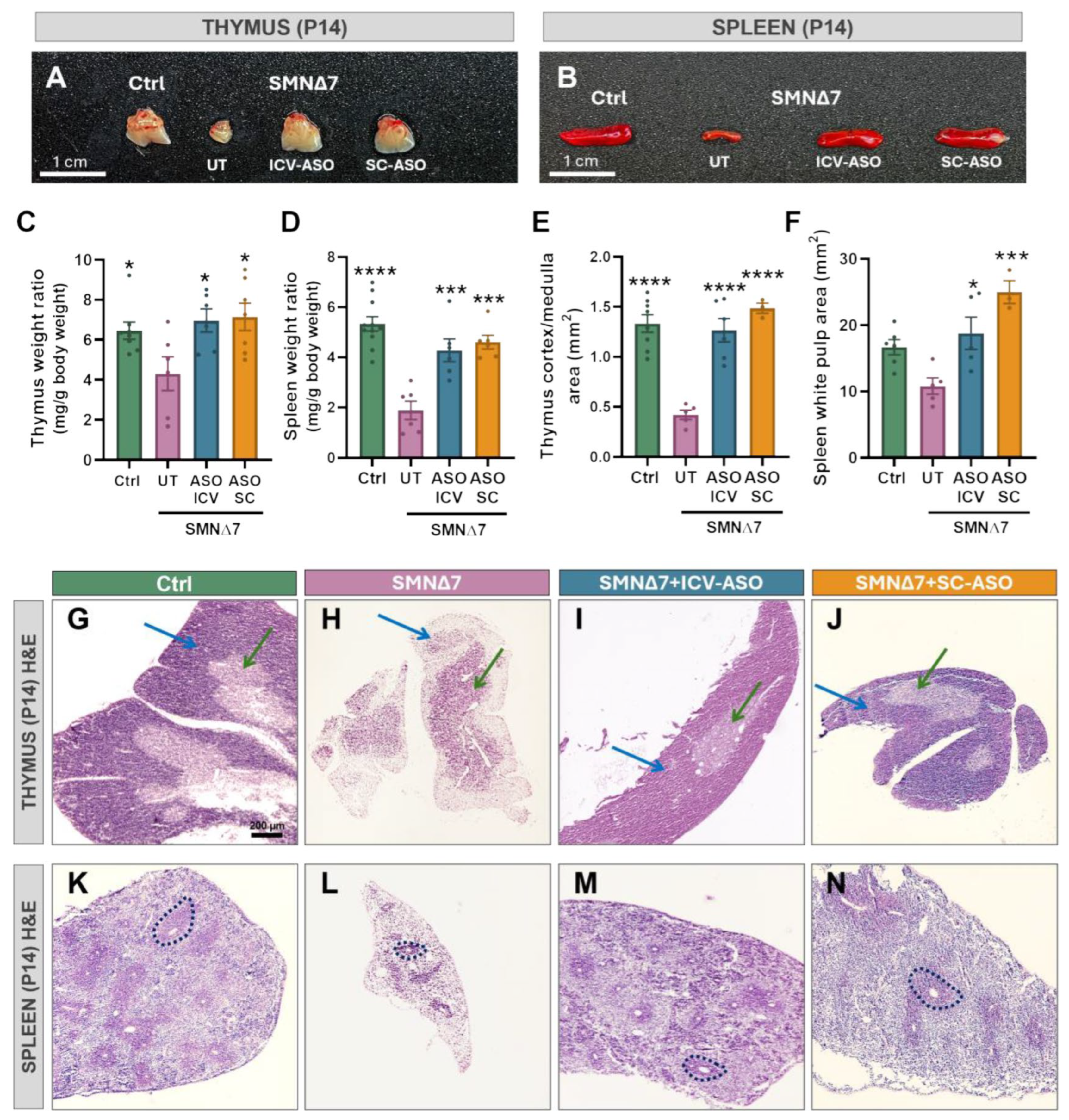 2.3. SMA Mice Display Thymic and Splenic Abnormalities That Are Prevented by SMN-ASO Treatment