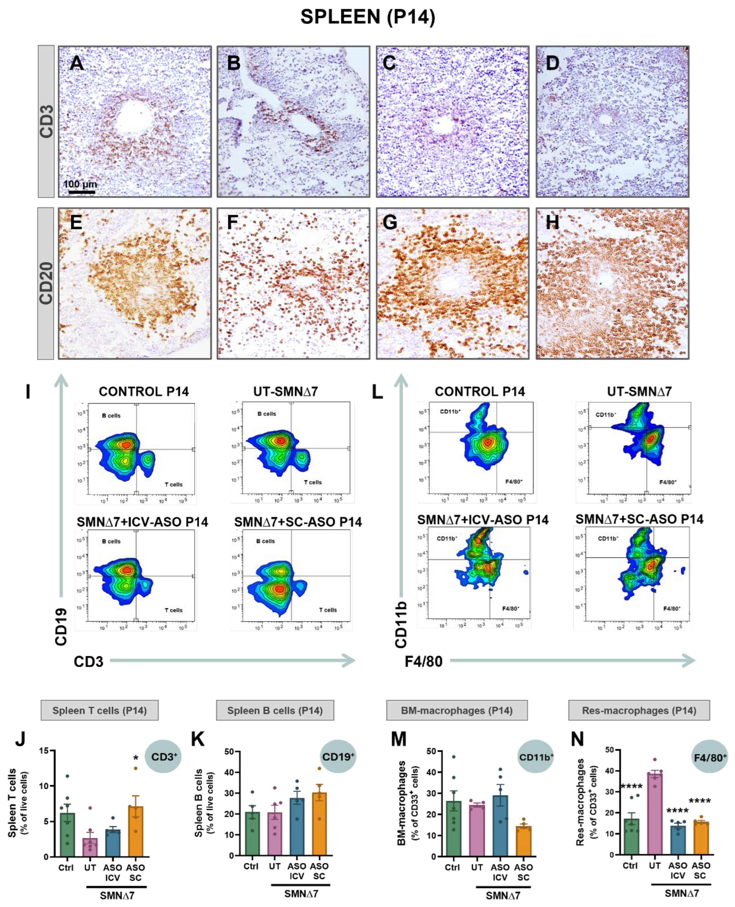 2.5. SMN-ASO Treatments Prevent Immune Cell Mislocation and Imbalance in the Spleen of SMNΔ7 Mice