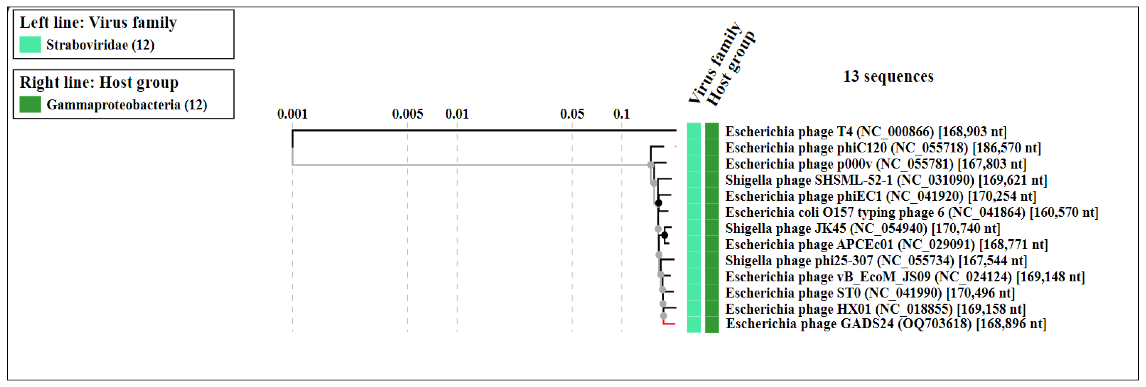 - Nishimura, Y.; Yoshida, T.; Kuronishi, M.; Uehara, H.; Ogata, H.; Goto, S. ViPTree: The viral proteomic tree server. Bioinformatics 2017, 33, 2379–2380. [Google Scholar] [CrossRef] [PubMed]
