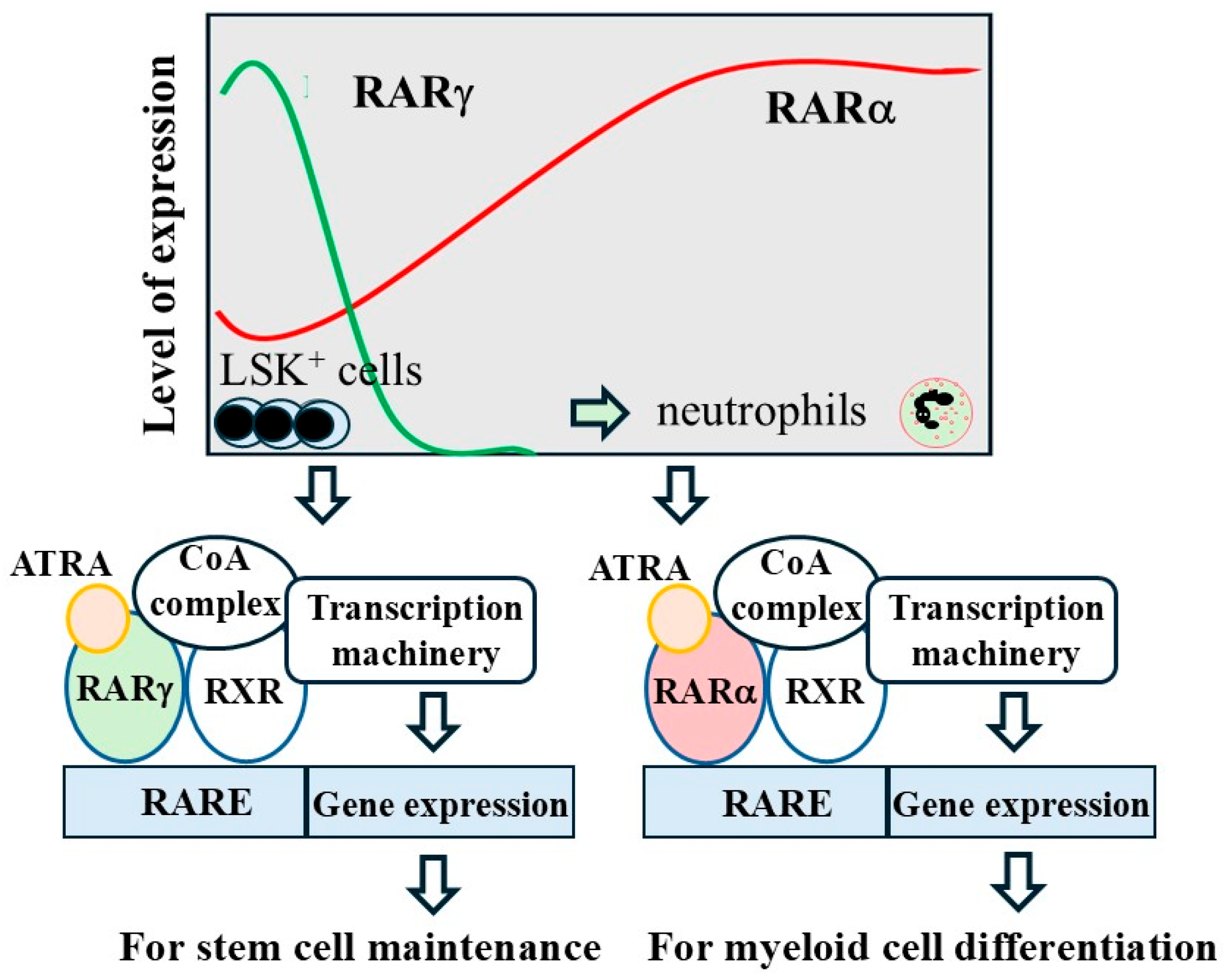 - Purton, L.E.; Dworkin, S.; Olsen, G.H.; Walkley, C.R.; Fabb, S.A.; Collins, S.J.; Chambon, P. RARγ is critical for maintaining a balance between hematopoietic stem cell self-renewal and differentiation. J. Exp. Med. 2006, 203, 1283–1293. [Google Scholar] [CrossRef]