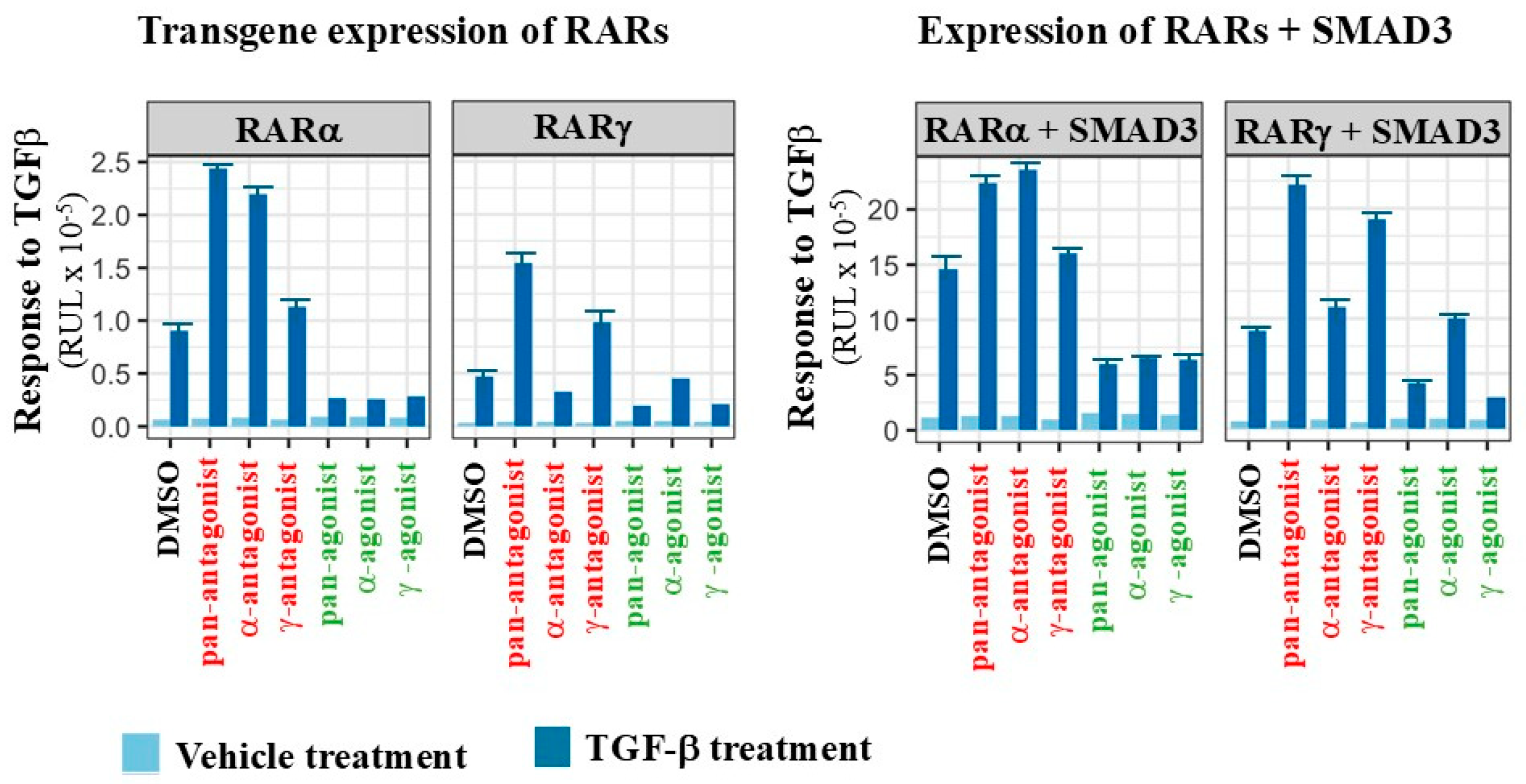 - Pendaries, V.; Verrecchia, F.; Michel, S.; Mauviel, A. Retinoic acid receptors interfere with TGF-β/Smad signaling pathway in a ligand-specific manner. Oncogene 2003, 22, 8212–8220. [Google Scholar] [CrossRef]