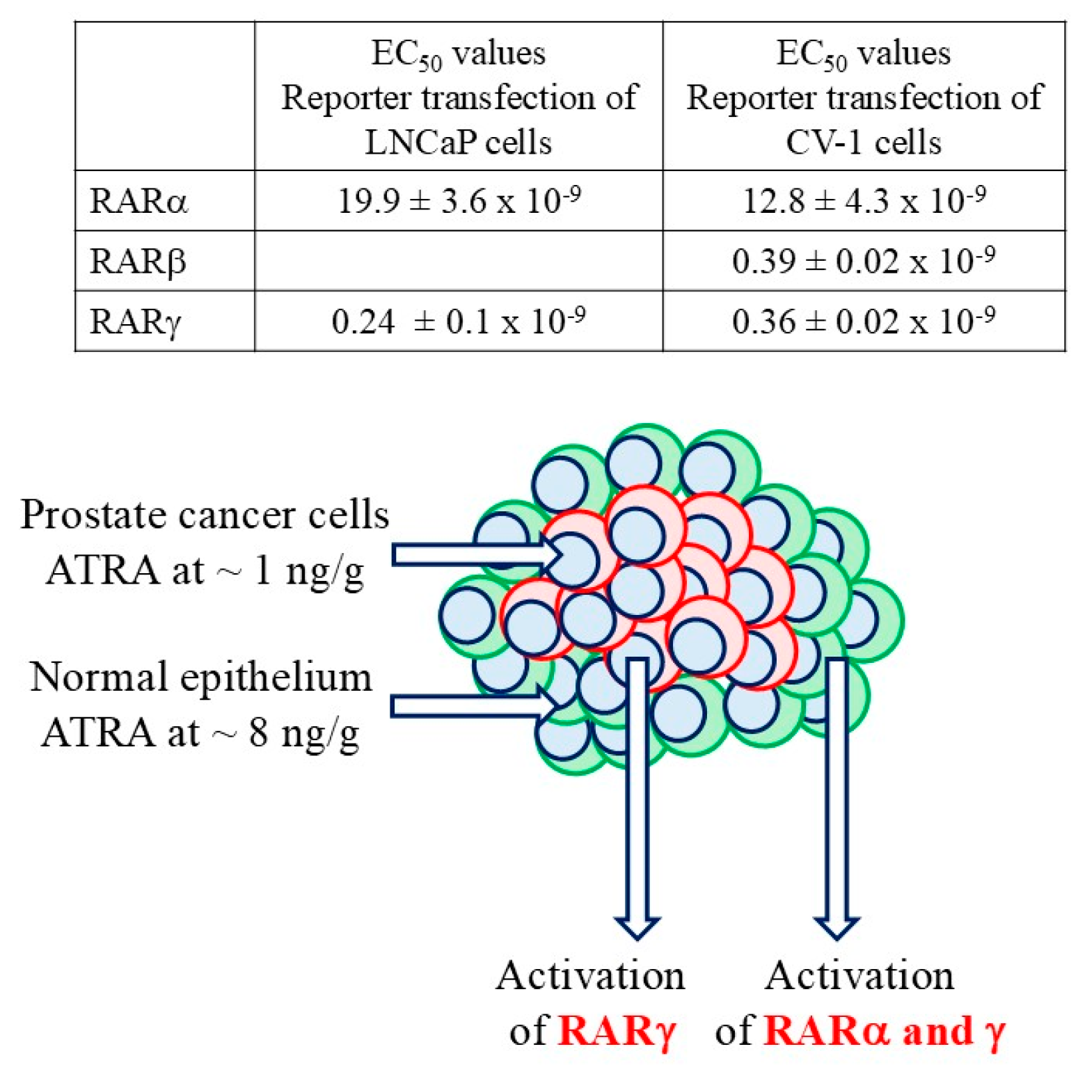 - Hammond, L.A.; Van Krinks, C.H.; Durham, J.; Tomkins, S.E.; Burnett, R.D.; Jones, E.L.; Chandraratna, R.A.S.; Brown, G. Antagonists of retinoic acid receptors (RARs) are potent growth inhibitors of prostate carcinoma cells. Br. J. Cancer 2001, 85, 453–462. [Google Scholar] [CrossRef]