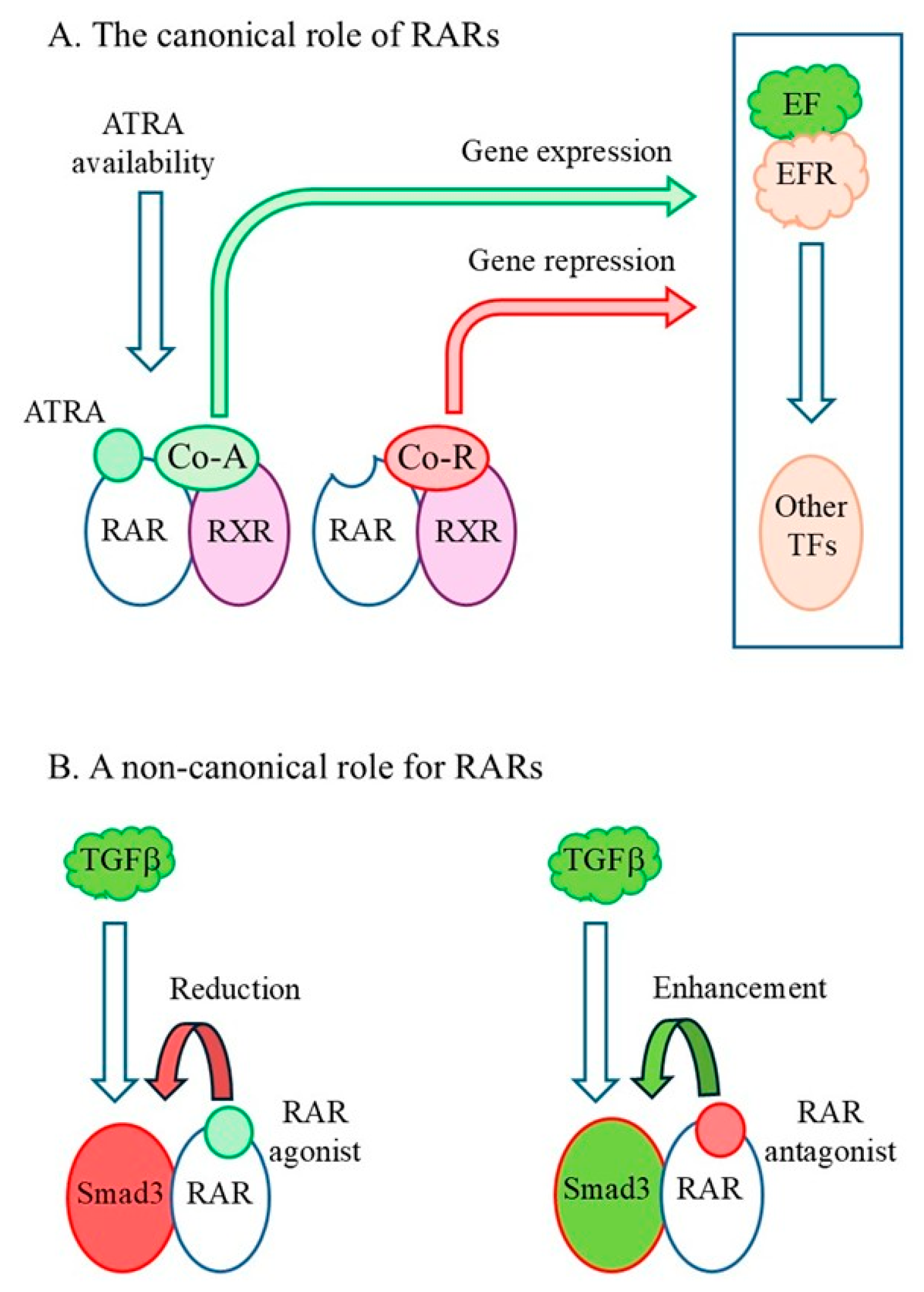 - Xu, Q.; Kopp, J. Retinoic and TGFβ families: Crosstalk in development, neoplasia, immunity and tissue repair. Semin. Nephrol. 2012, 32, 287–293. [Google Scholar] [CrossRef] [PubMed]