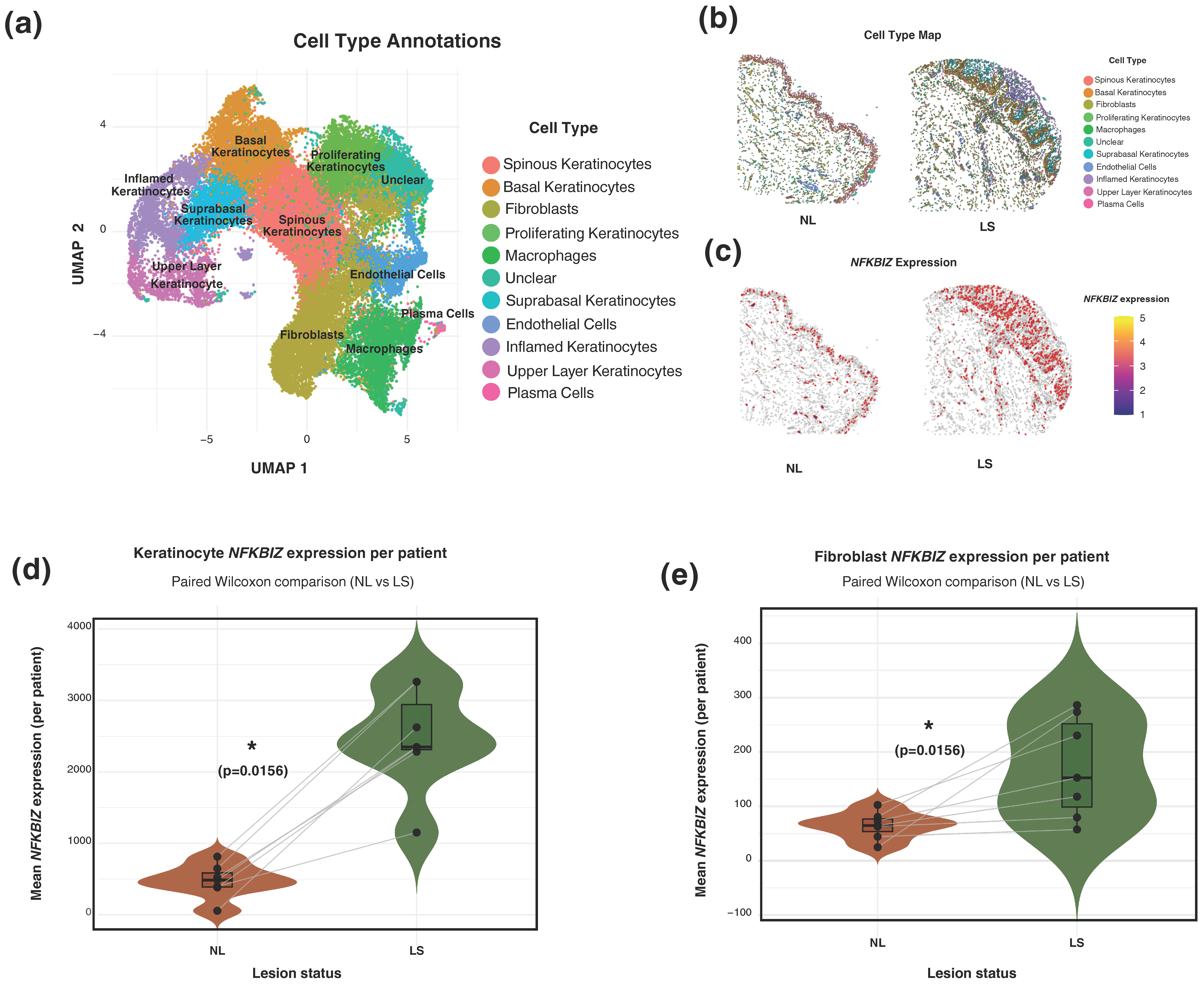 2.4. CosMx Spatial Molecular Imaging Confirms NFKBIZ Expression in Keratinocytes and Identifies Its Expression in Dermal Fibroblasts Within Psoriatic Lesions