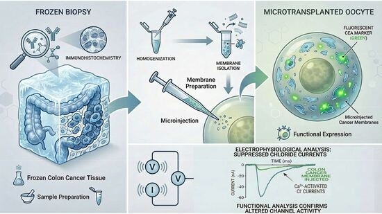In this context, our study proposes an innovative, translational, and methodological approach based on the analysis of cell membranes extracted from different types of cancer samples, including a patient biopsy and cell lines, collected and stored in liquid nitrogen. This strategy enables the “reanimation” of frozen patient-derived cancer tissues in Xenopus oocytes, providing a unique opportunity to reutilize otherwise inaccessible clinical samples. Furthermore, by characterizing in vitro the molecular and functional properties of cancer ion channels, this model allows the investigation of pathophysiological mechanisms in non-neurological cancers, such as colon and pancreatic cancer. Ultimately, this methodological framework and translational approach aim to maximize the scientific value of precious frozen clinical specimens to carry out studies aimed at identifying potential diagnostic/therapeutic targets for cancer or other chronic disorders.