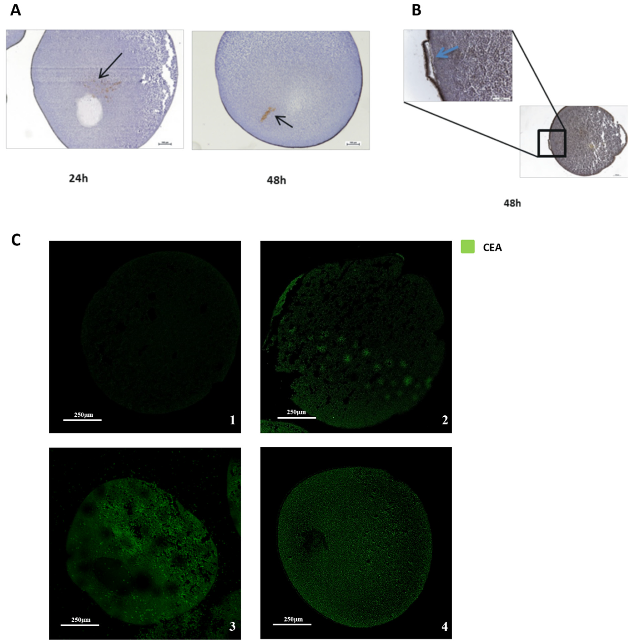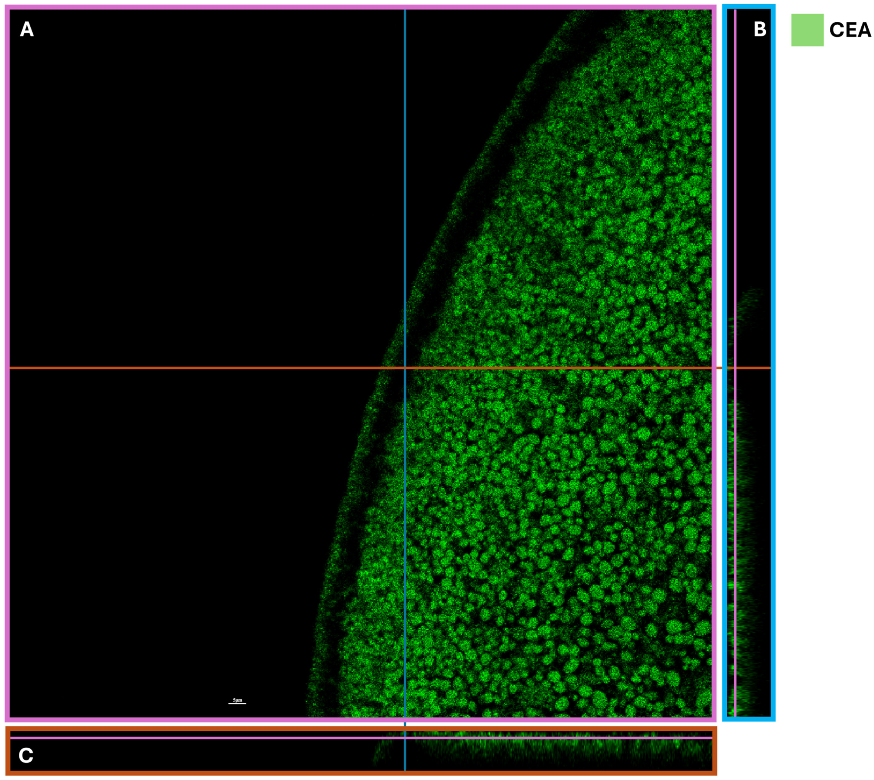 Our findings demonstrated, in particular, that these cancer membranes were still able to express pertinent markers even after prolonged freezing times. These results were further supported by confocal microscopy analysis of immunofluorescence staining with the same anti-CEA antibody used in immunohistochemical studies. Moreover, the TEM images acquired on the microinjected