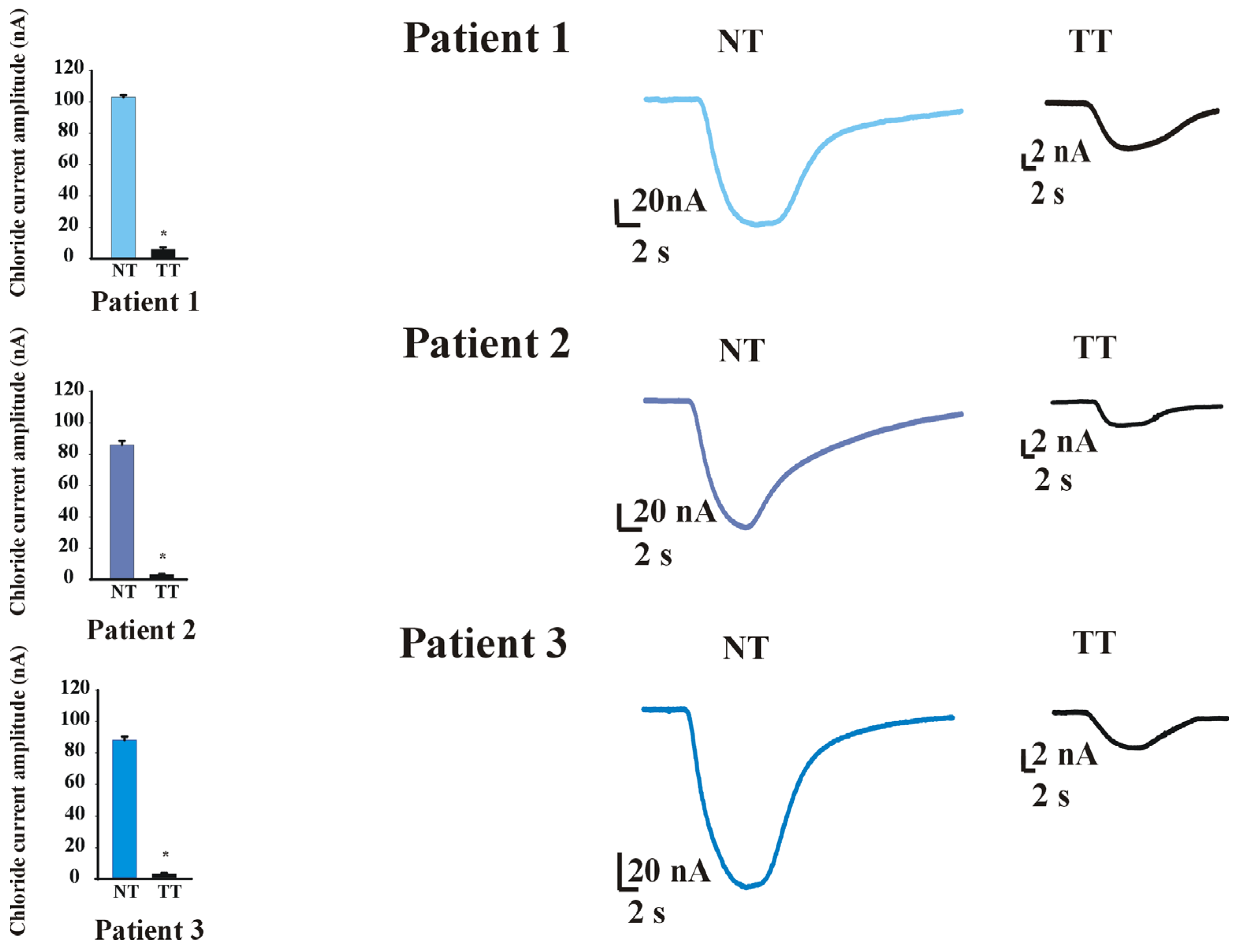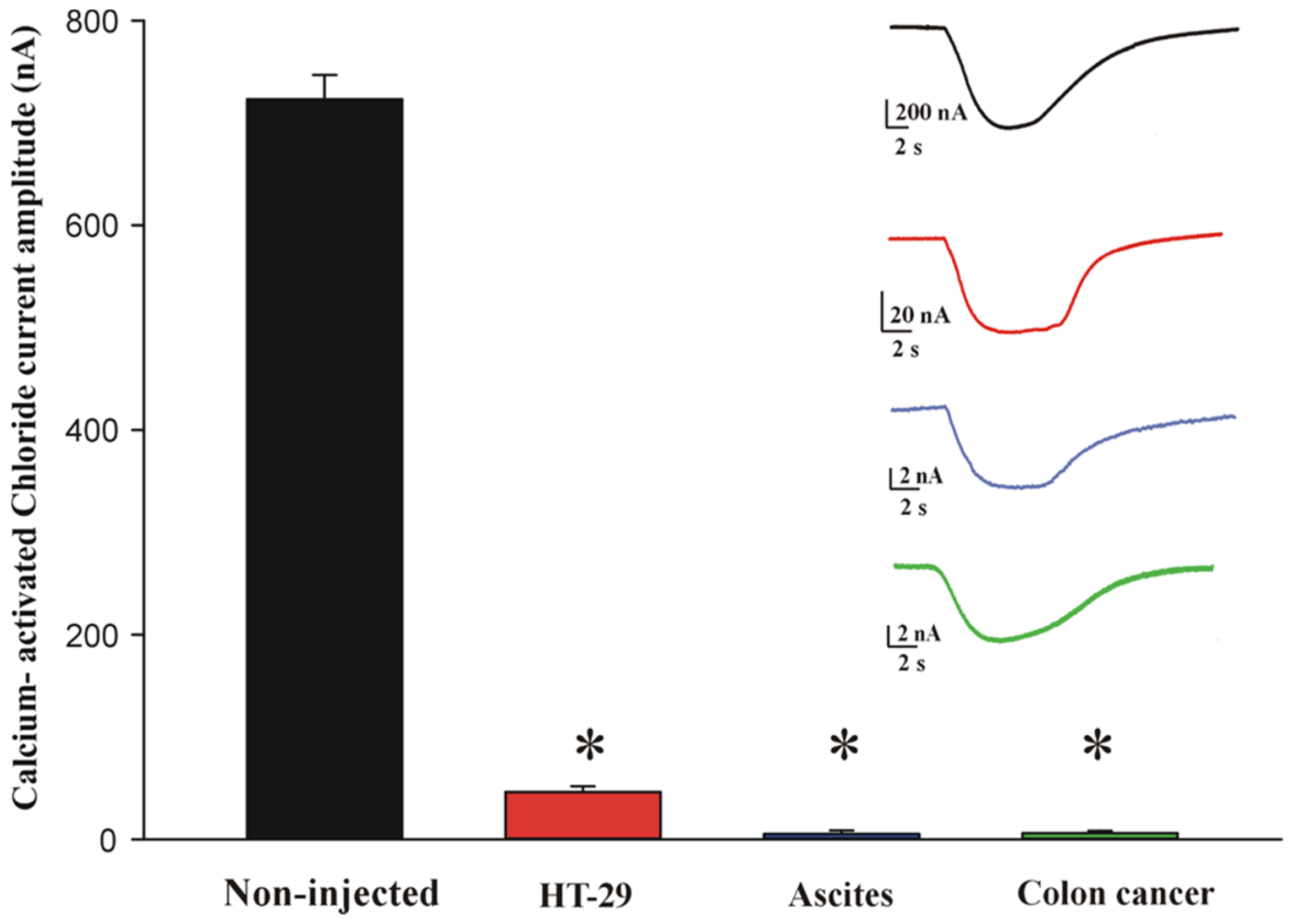 5]. In this framework, our results strengthen this hypothesis and suggest that cancer membranes incorporate factors that contribute to the inhibition of calcium-activated chloride channels, while, notably, in healthy mucosal tissue, calcium-activated chloride currents are preserved, a result that is in line with our previous observations using brain tissues [
