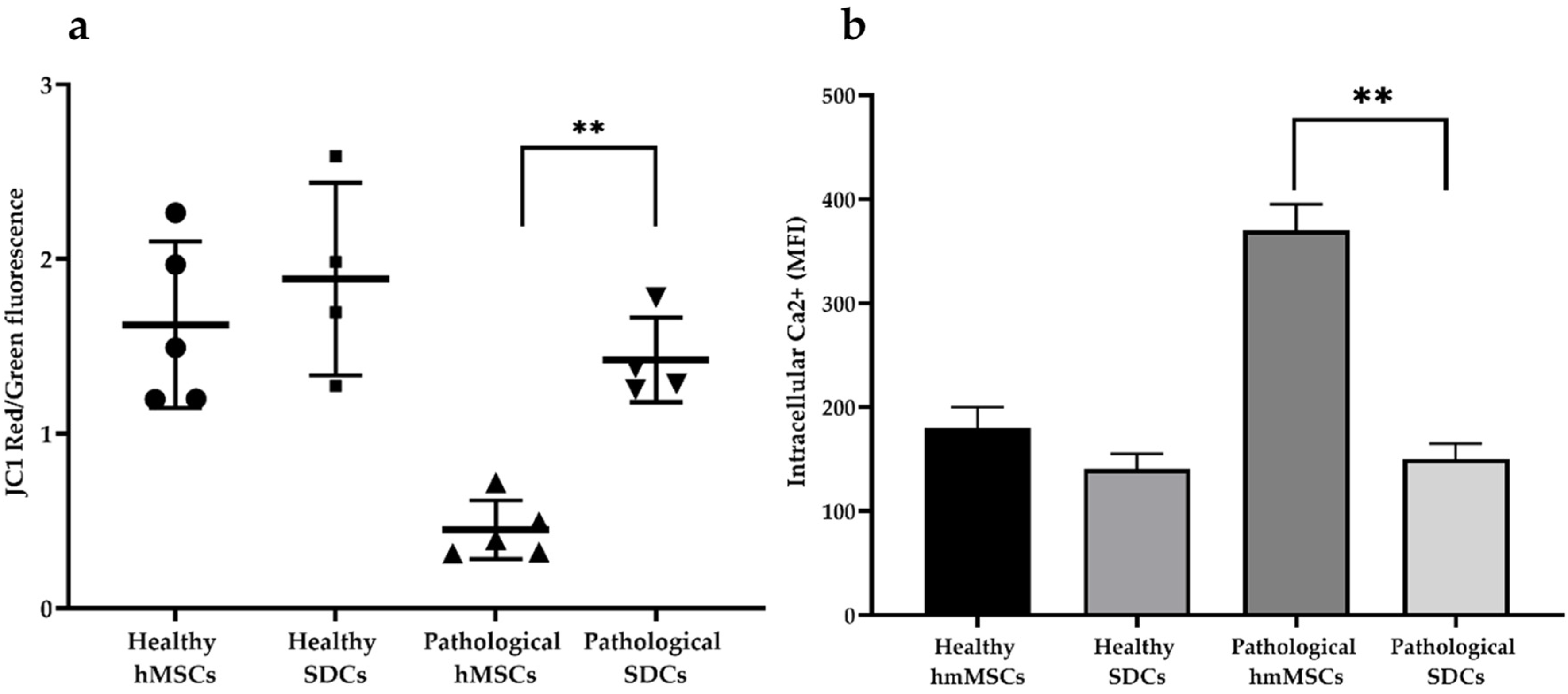 2.3. Mitochondrial Membrane Potential (MMP) and iCa2+ of Healthy and Pathological hmMSCs and SDCs