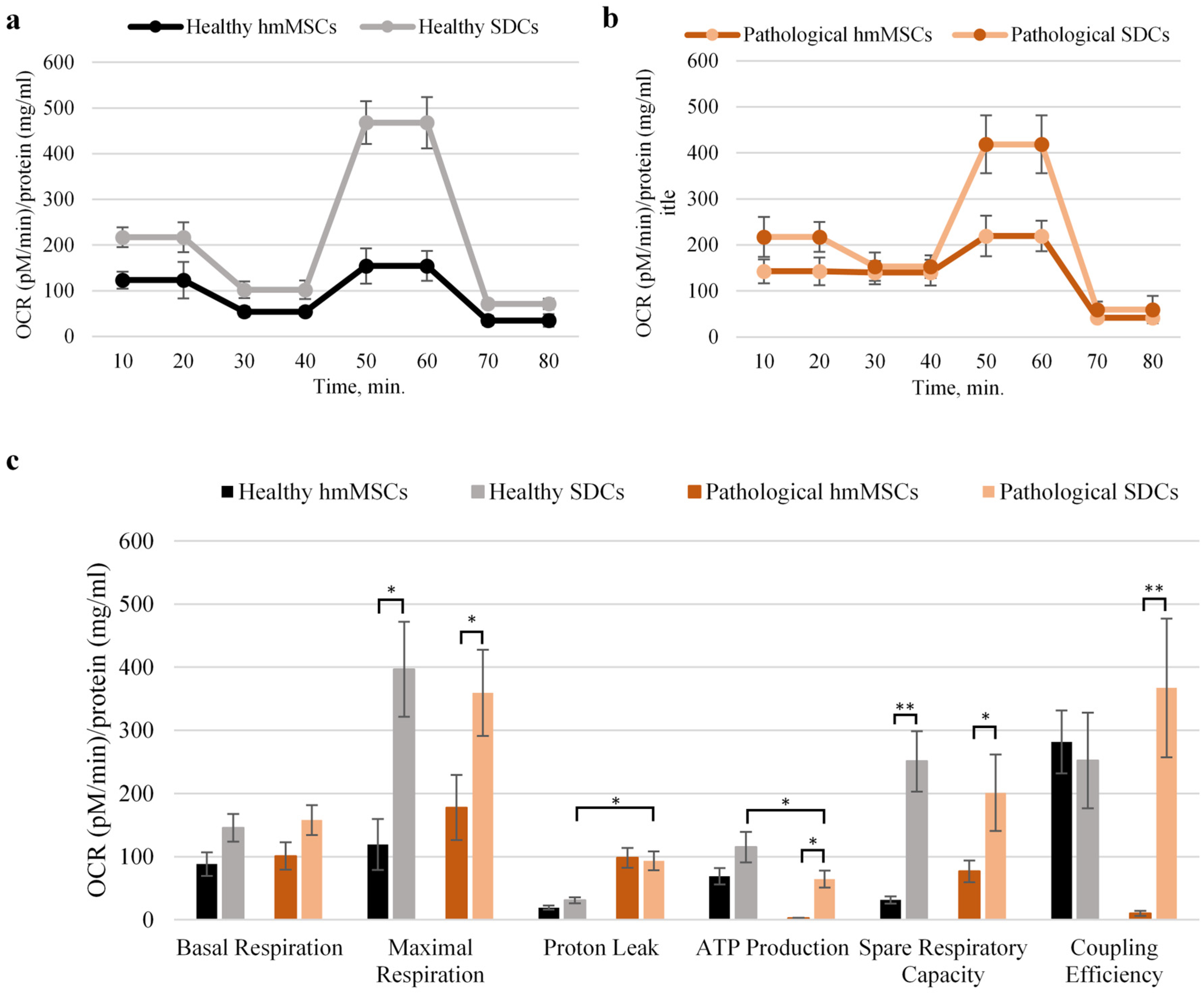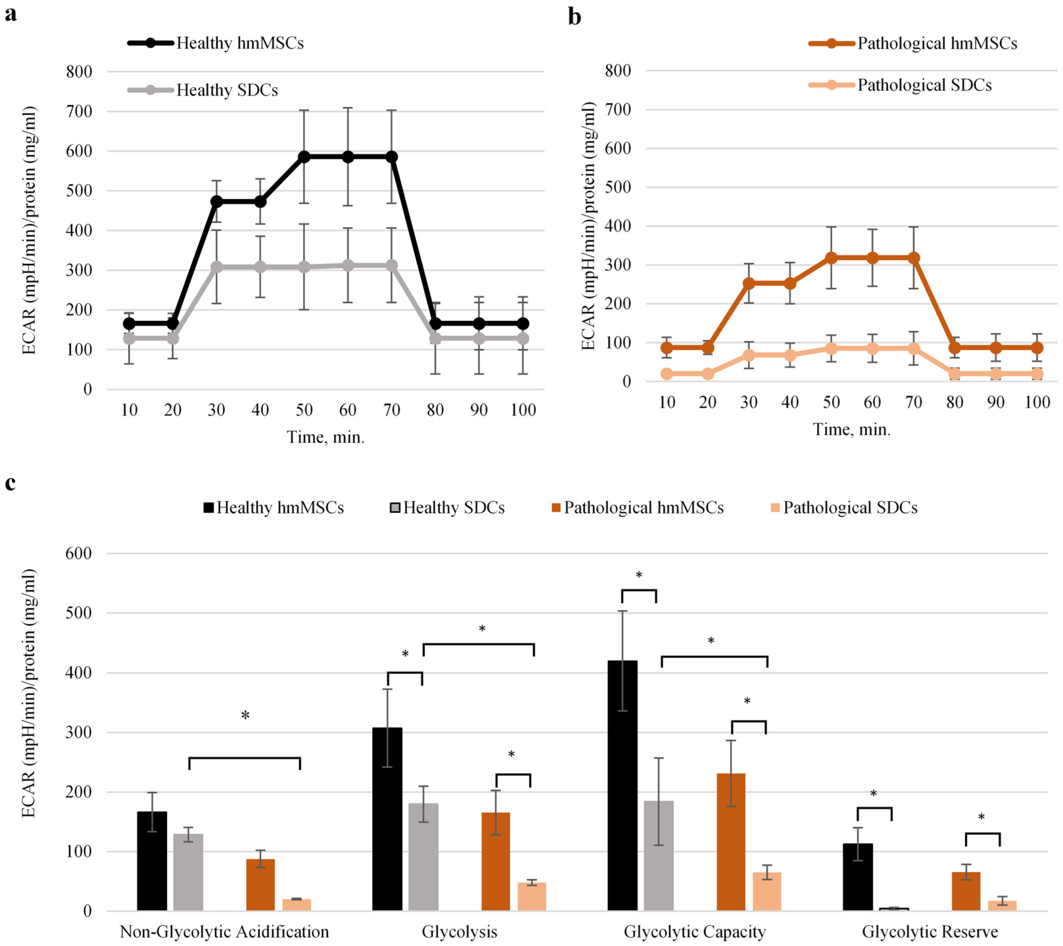 2.4. Oxidative Phosphorylation and Glycolysis of Healthy and Pathological hmMSCs and SDCs