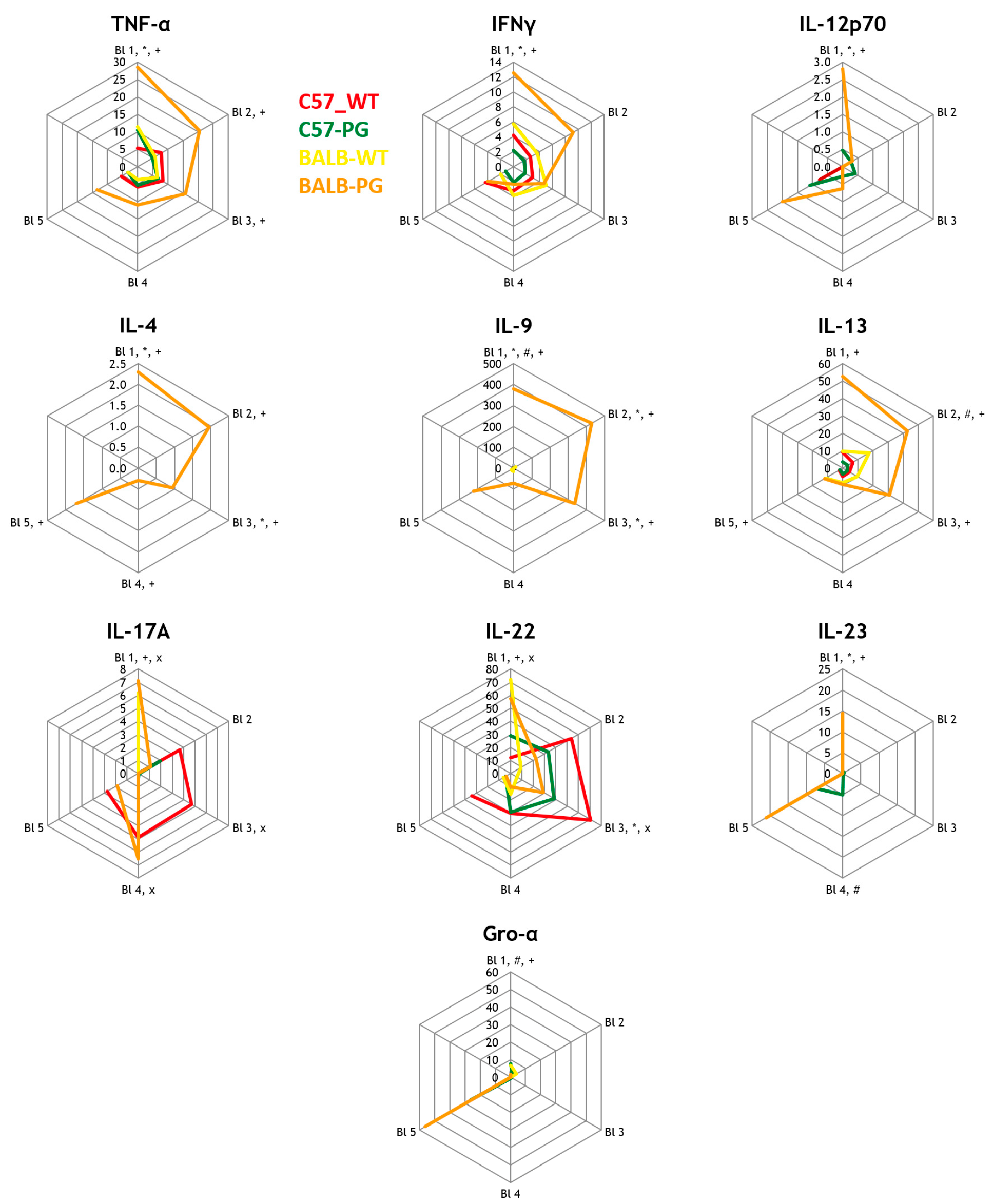 Figure 1. Strain effect (immune background): C57-PG vs. BALB-PG with non-immunized strain controls. Longitudinal serum cytokine concentrations (26-plex) are shown as radar plots of median values across bleeding time points B1–B5 (angular axis) with concentration (pg/mL) on the radial axis. Groups are displayed in a consistent order and color scheme: C57-WT (red; n = 8), C57-PG (green; n = 16), BALB-WT (pink; n = 7), BALB-PG (orange; n = 9). Predefined pairwise comparisons at each time point were tested using Mann–Whitney U tests; symbols next to the time-point label indicate which comparison(s) were tested and reached nominal significance at that time point, using the following key: * C57-PG vs. C57-WT; + BALB-PG vs. BALB-WT; # C57-PG vs. BALB-PG; × C57-WT vs. BALB-WT. Complete unadjusted p-values and BH–FDR-adjusted q-values (family-wise) for all cytokines/time points are provided in the Supplementary Materials (Table S1). Abbreviations: TNF-α, tumor necrosis factor alpha; IFNγ, interferon gamma; IL, interleukin; Gro-α/CXCL1, growth-regulated oncogene alpha/chemokine (C-X-C motif) ligand 1.