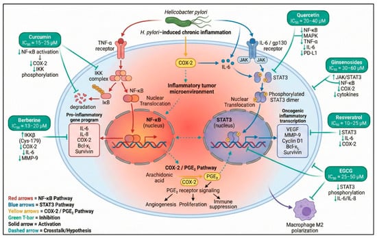 Helicobacter pylori infection represents a critical upstream driver of gastric carcinogenesis and provides a mechanistic link between chronic inflammation and malignant transformation. Persistent colonization induces sustained inflammatory signaling, oxidative DNA damage, epigenetic alterations, and progressive mucosal remodeling along the Correa cascade [30,31]. Importantly, several natural products have demonstrated the capacity to modulate H. pylori-associated pathogenic mechanisms, either by exerting direct antibacterial effects or by attenuating inflammation-driven signaling pathways such as NF-κB and STAT3. These properties position natural compounds as potential modulators of early carcinogenic events as well as downstream tumor-promoting processes.