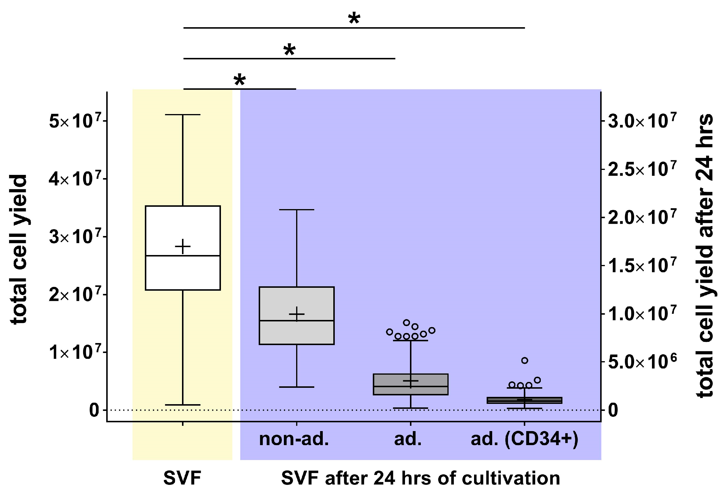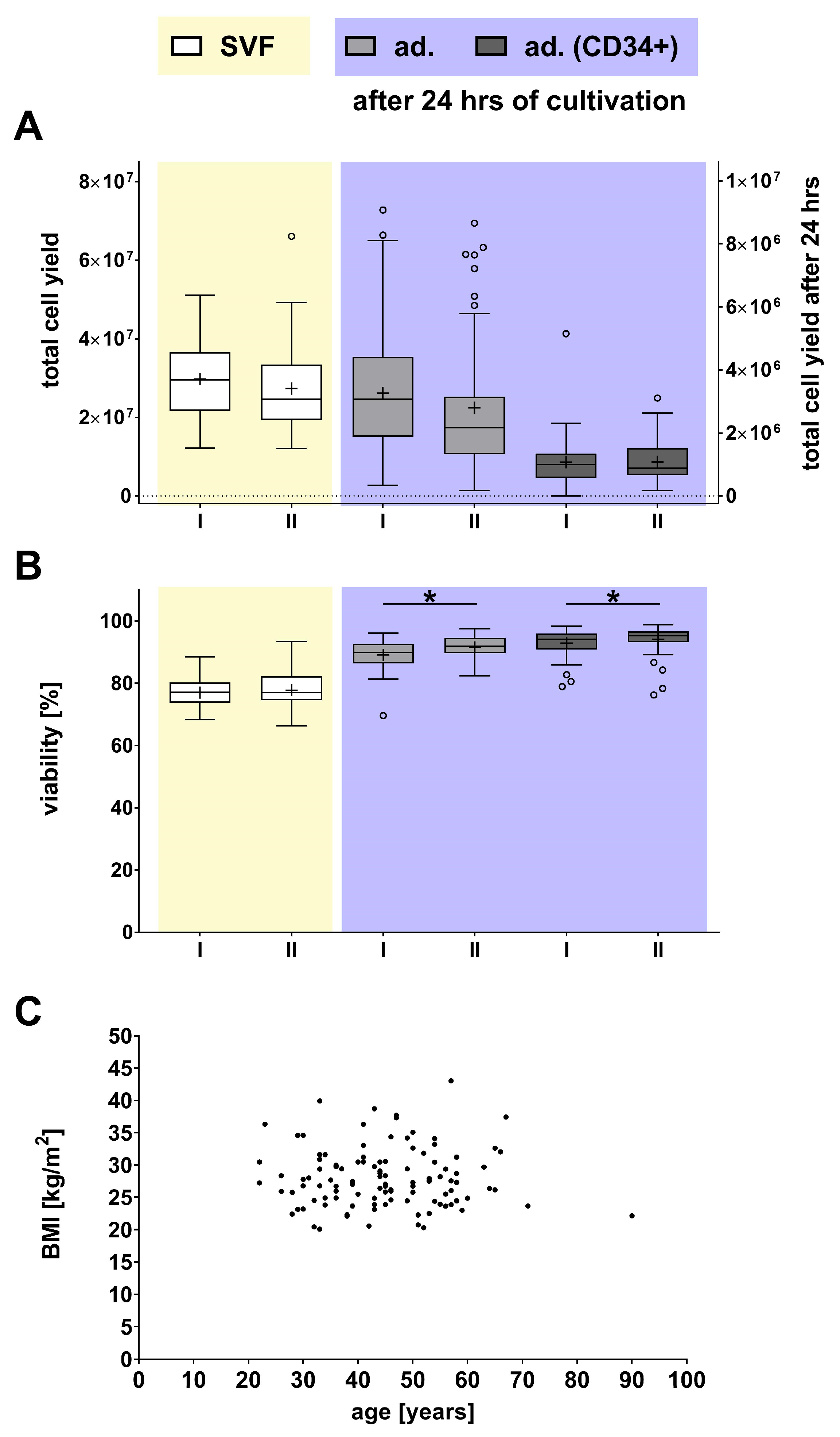 - Donor age slightly increased cell viability (+2.74% in adherent cells, +1.33% in CD34-positive cells for the >44.5 years cohort) without affecting cell yield or size.