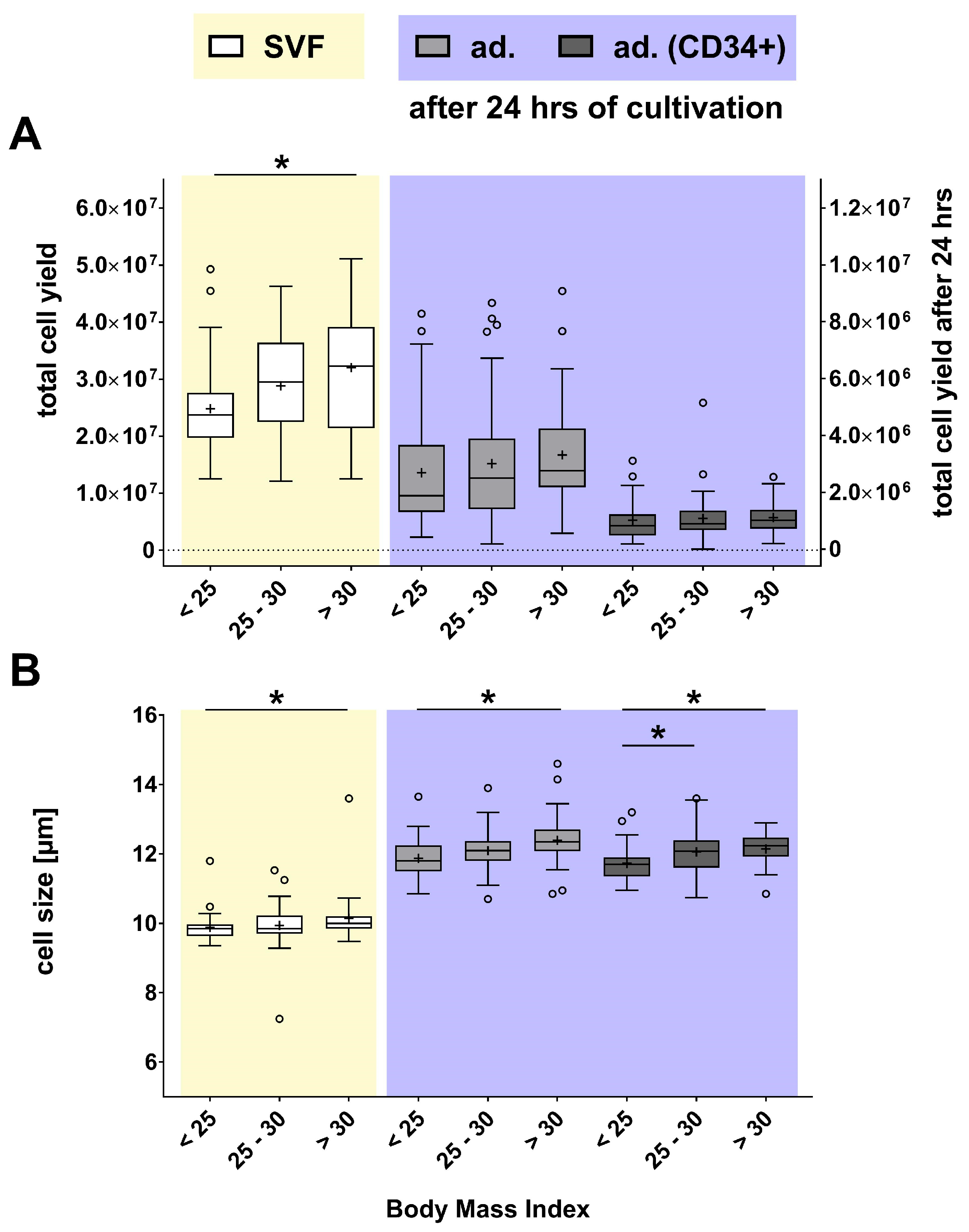 - BMI (body weight/height2) significantly increased both cell yield and size in overweight/obese donors, while viability remained unaffected.