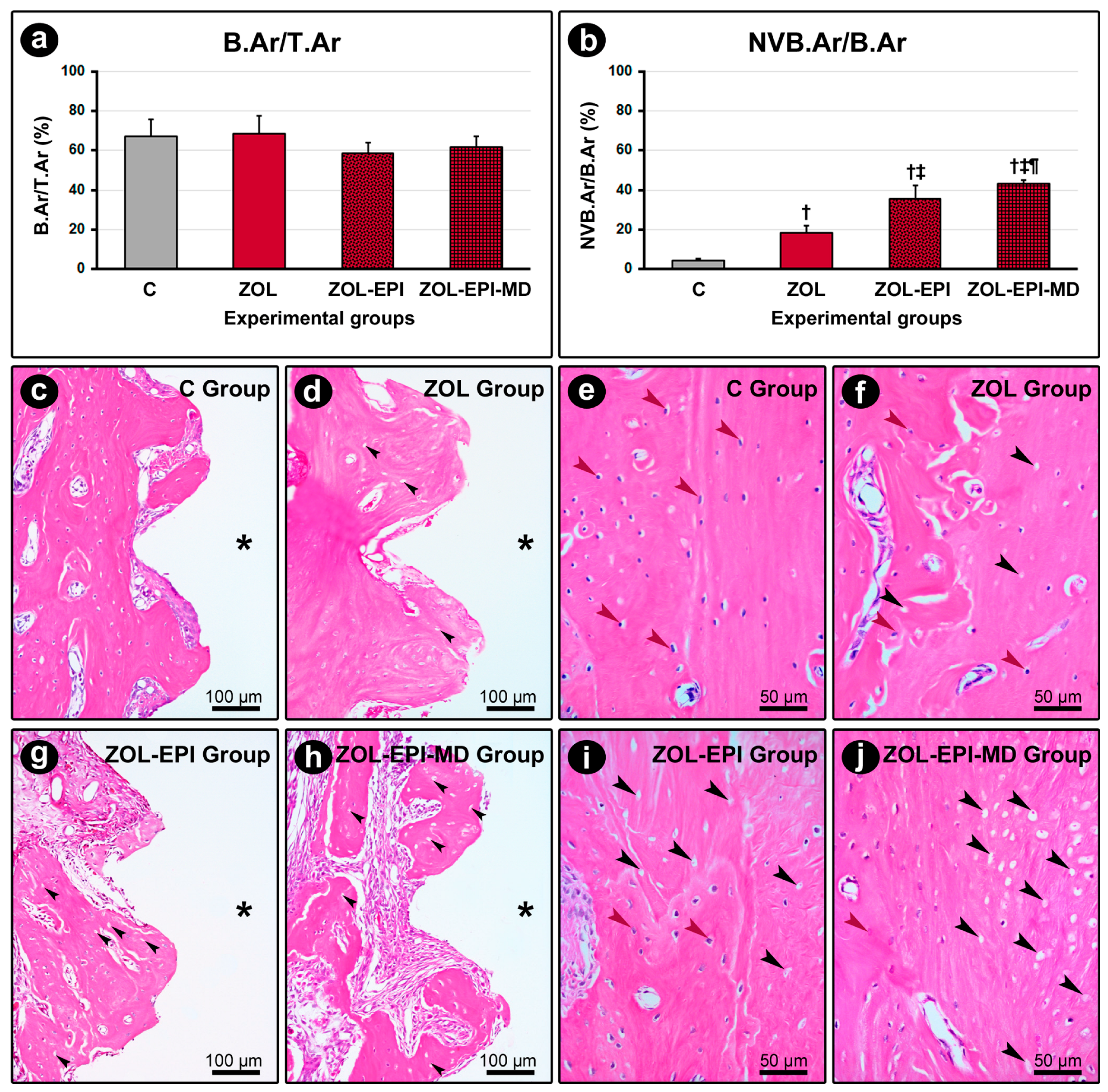 4.15. Histometric Analyses of the Percentage of Total Bone Tissue (B.Ar/T.Ar) and the Percentage of Non-Vital Bone Tissue (NVB.Ar/B.Ar)