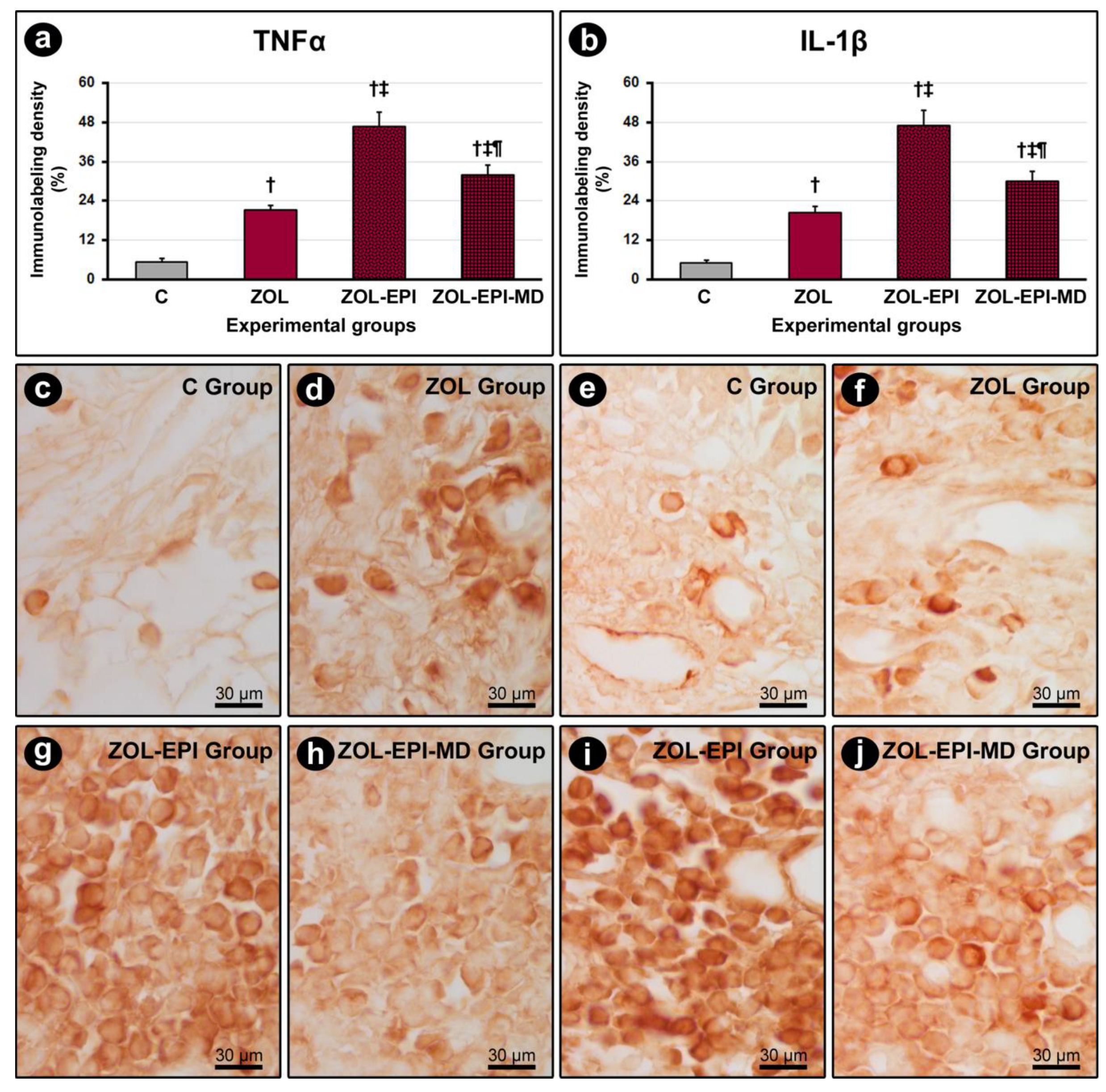 2.4. Immunolabeling for TNFα, IL-1β, VEGF, and OCN in Peri-Implant Tissues
