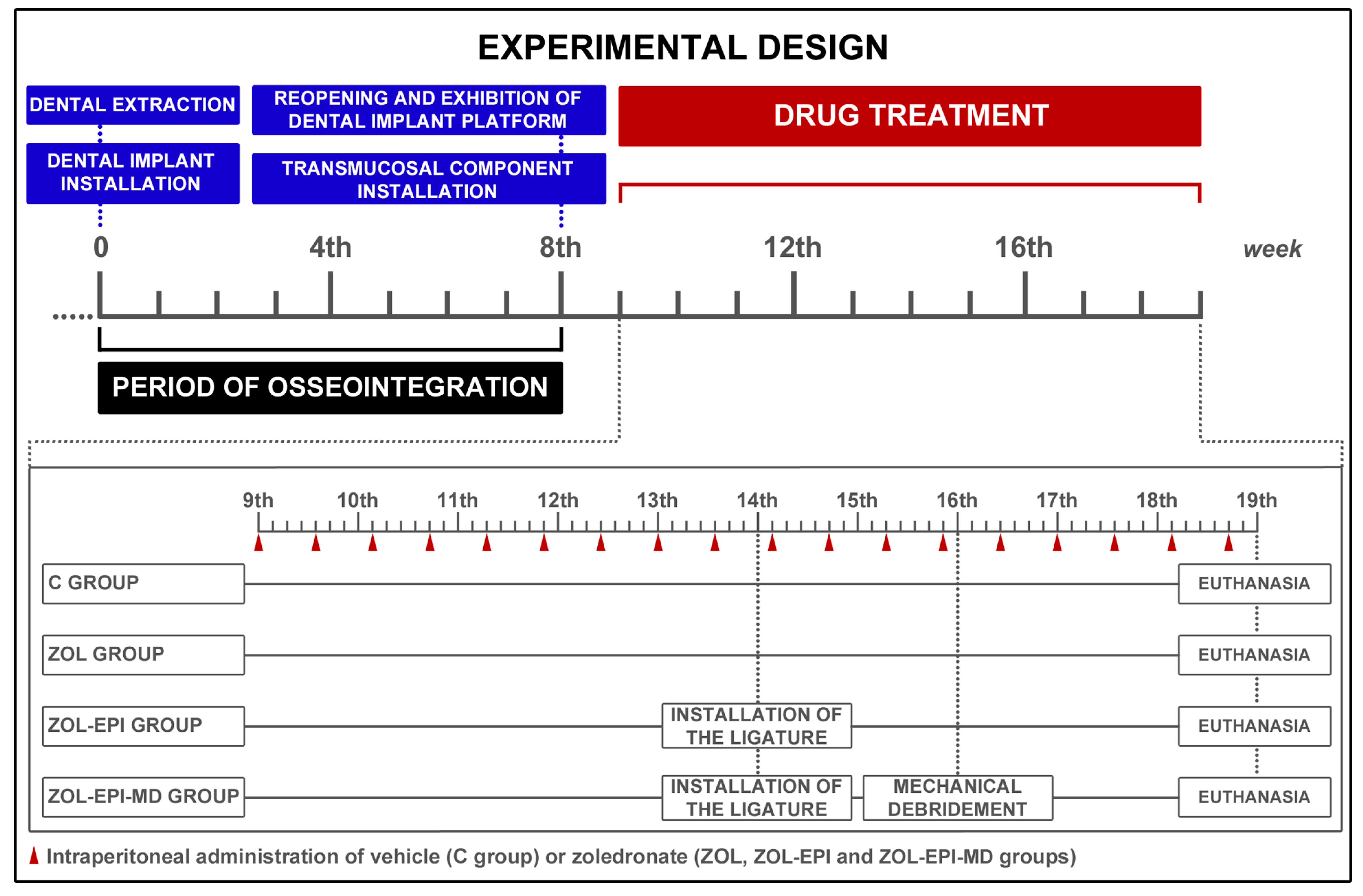 - Quintão Manhanini Souza, E.; Felipe Toro, L.; Franzão Ganzaroli, V.; Freire, J.d.O.A.; Matsumoto, M.A.; Casatti, C.A.; Cintra, L.T.Â.; Buchaim, R.L.; Issa, J.P.M.; Garcia, V.G.; et al. Peri-implantitis increases the risk of medication-related osteonecrosis of the jaws associated with osseointegrated implants in rats treated with zoledronate. Sci. Rep. 2024, 14, 627. [Google Scholar] [CrossRef]