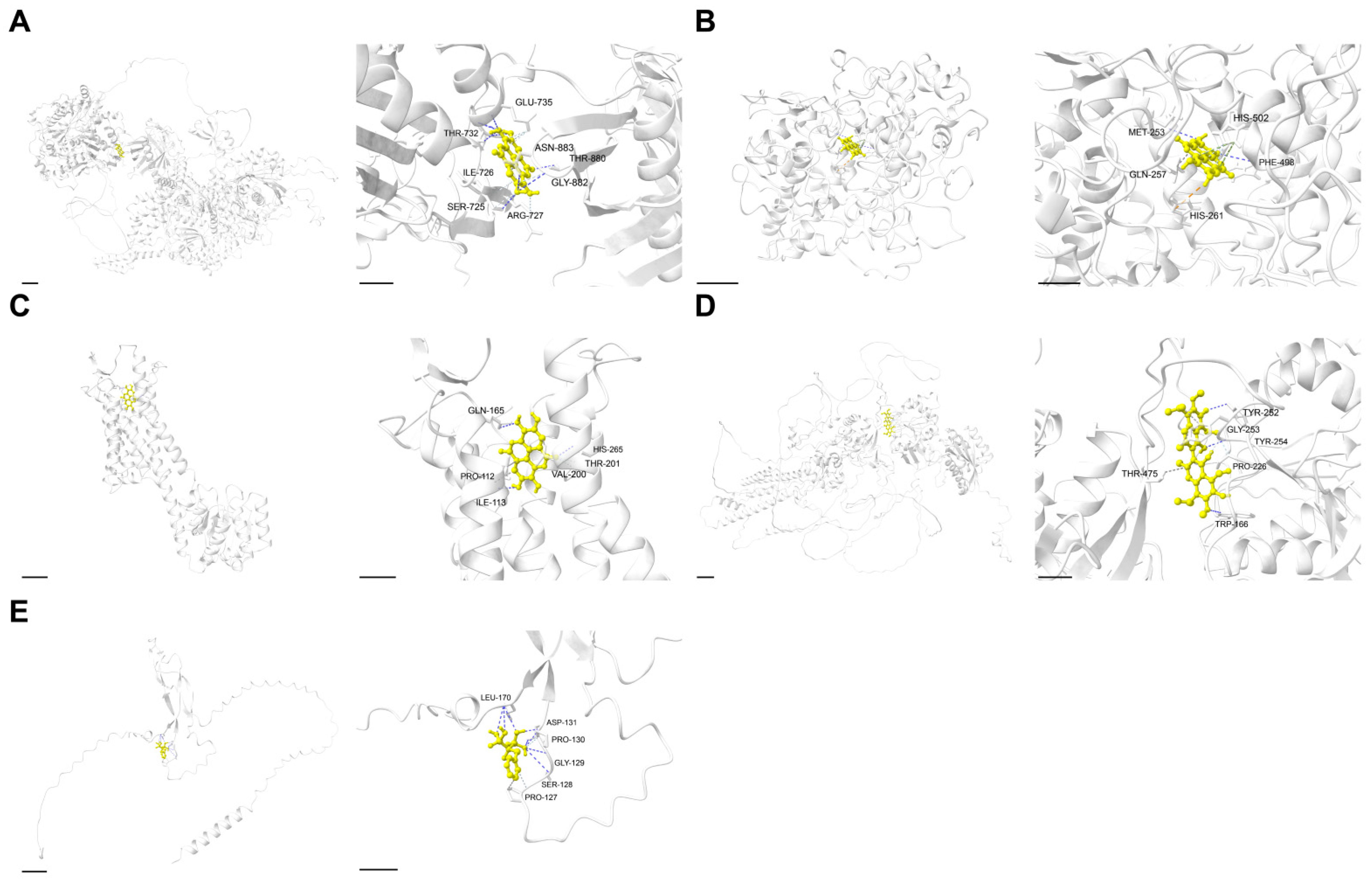 2.4. Molecular Docking Validated Strong Binding Affinities of Key Targets with MFH-Derived Compounds
