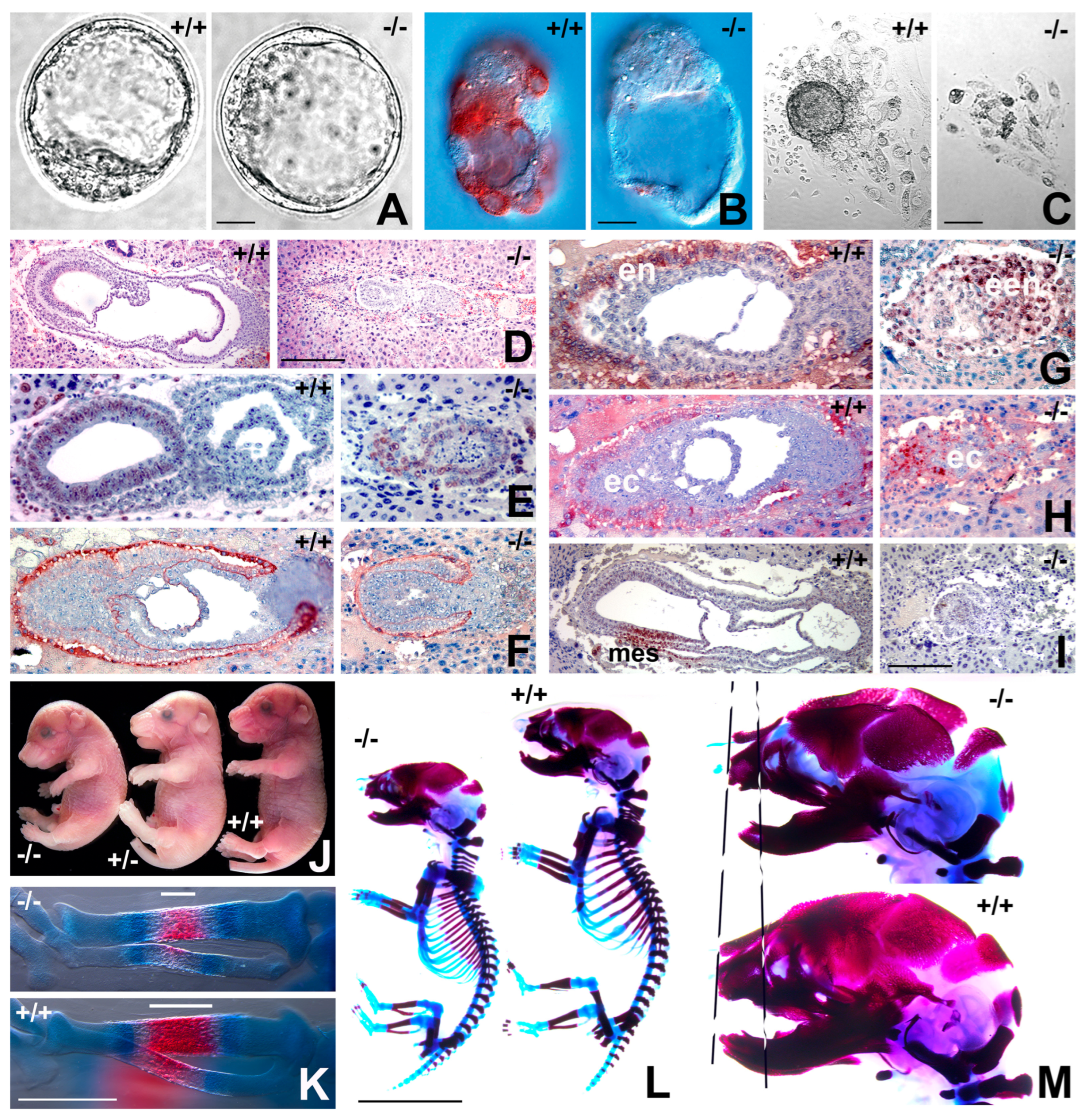 WT and Cfdp1 KO embryos were fixed in 10% neutral buffered formalin and embedded in paraffin wax. Further, 6 µm sections were cut and stained with hematoxylin-eosin or subjected to immunohistochemistry using Histostain plus Broad Spectrum kit (Life Technologies, Carlsbad, CA, USA). Sections were incubated with primary antibodies overnight at 4 °C, treated with HRP-conjugated secondary antibodies and protein localization was revealed using the AEC Red kit (Life Technologies). For cell proliferation assays, BrdU (Sigma) was injected (100 mg/kg body weight) in pregnant mice on the 6th gestational day. Embryos were harvested after 2 h, fixed in Carnoy’s fixative, dehydrated and embedded in paraffin wax. BrdU incorporation was revealed using the BrdU IHC Kit (EMD Millipore, Burlington, MA, USA).