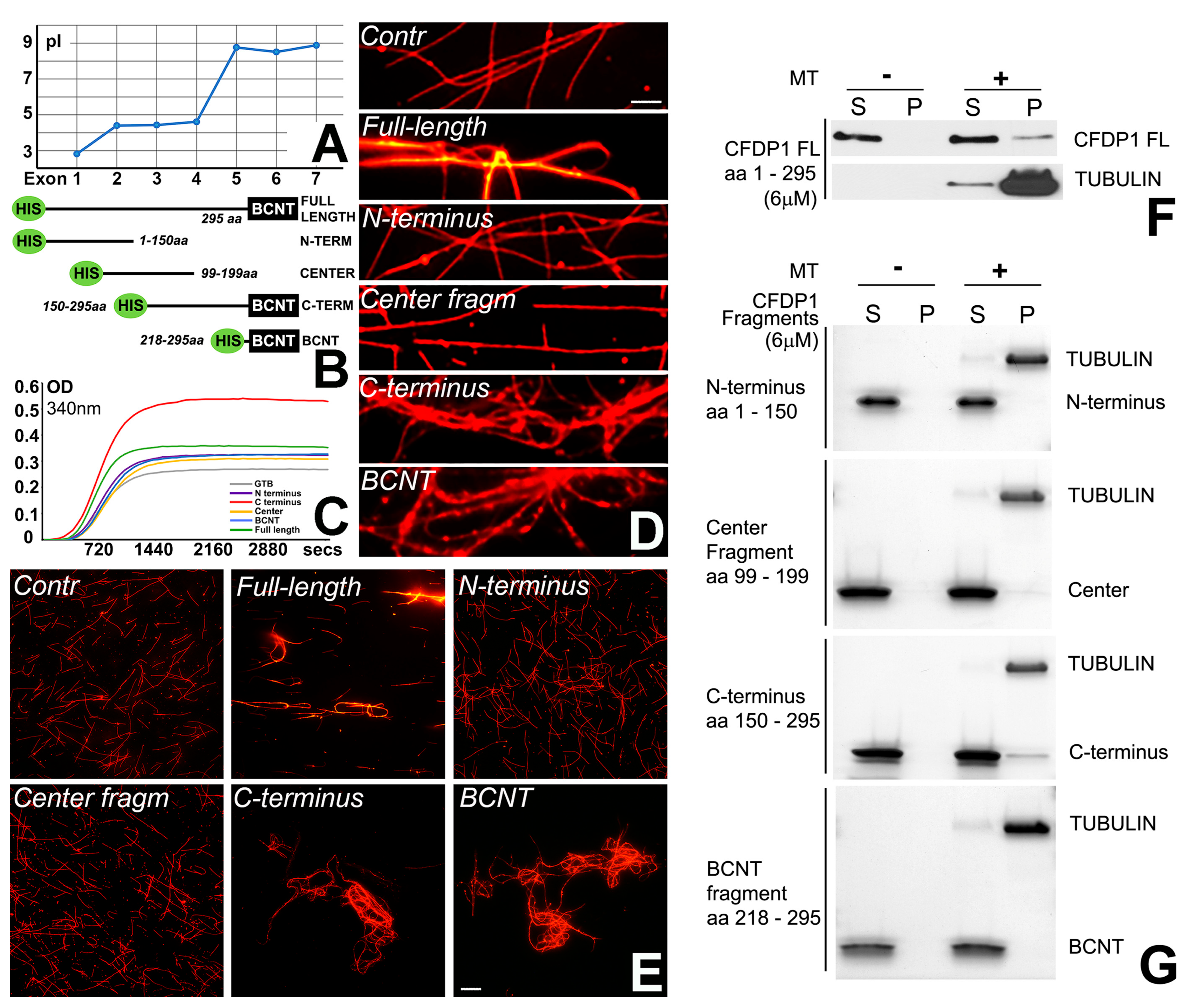 Our study demonstrated that the basic CFDP1 C-terminus and not the acidic N-terminus of the CFDP1 protein interacted with tubulin, promoted microtubule bundling and polymerization. There are two prominent regions within the CFDP1 C-terminus that may account for these robust microtubule bundling and polymerization properties, the lysine/glutamic acid/proline-rich 40 aa stretch intramolecular repeat (IR) region [