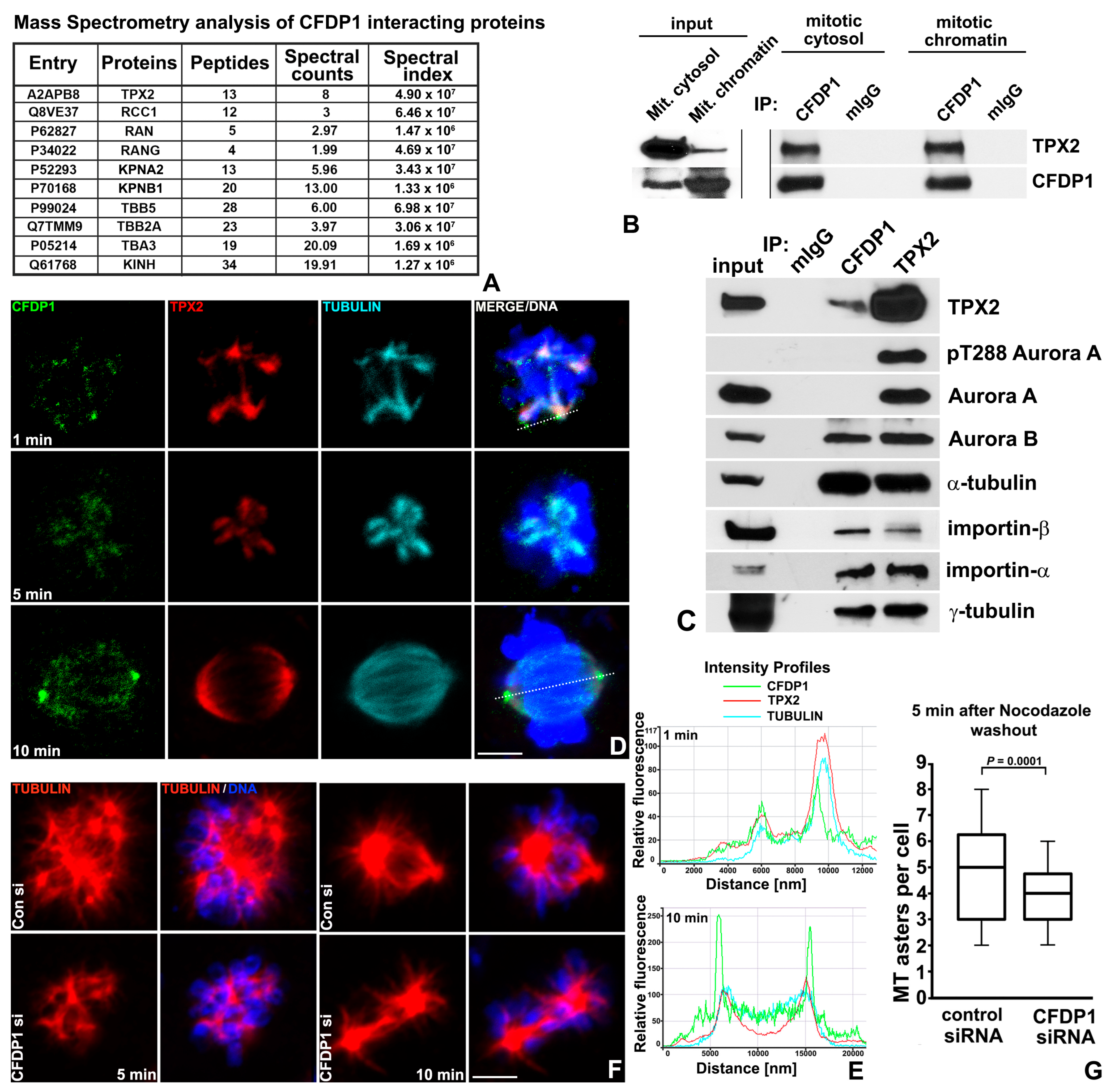 In the present study, we used a broad range of approaches to probe the role of the CFDP1 chromatin protein as it relates to embryonic development and mitotic spindle formation. CFDP1 null mice were introduced to determine their role in embryonic survival. CFDP1 was localized to the mitotic spindle of dividing cells and siRNA-mediated CFDP1 knockdown was performed to test the role of CFDP1 in cell cycle progression and K-fiber formation. Discrete CFDP1 N-terminal, center, C-terminal and BCNT fragments were generated to determine the effect of individual CFDP1 fragments on the structural and biophysical properties of microtubules. Co-immunoprecipitation and mass spectrometry assays were performed to examine the role of CFDP1 within the RanGTP pathway of microtubule nucleation. Focusing on TPX2 and Aurora A, interactions between CFDP1 and TPX2 triggering Aurora A activation were confirmed. Additional binding assays were performed to verify the role of the CFDP1 NLS binding region as it relates to TPX2 activation and MT nucleation. Together, our studies have established CFDP1 as an essential bipartite MAP that facilitates nuclear TPX2 activation through importin α dissociation and promotes chromosomal microtubule nucleation in conjunction with TPX2 and Aurora A.