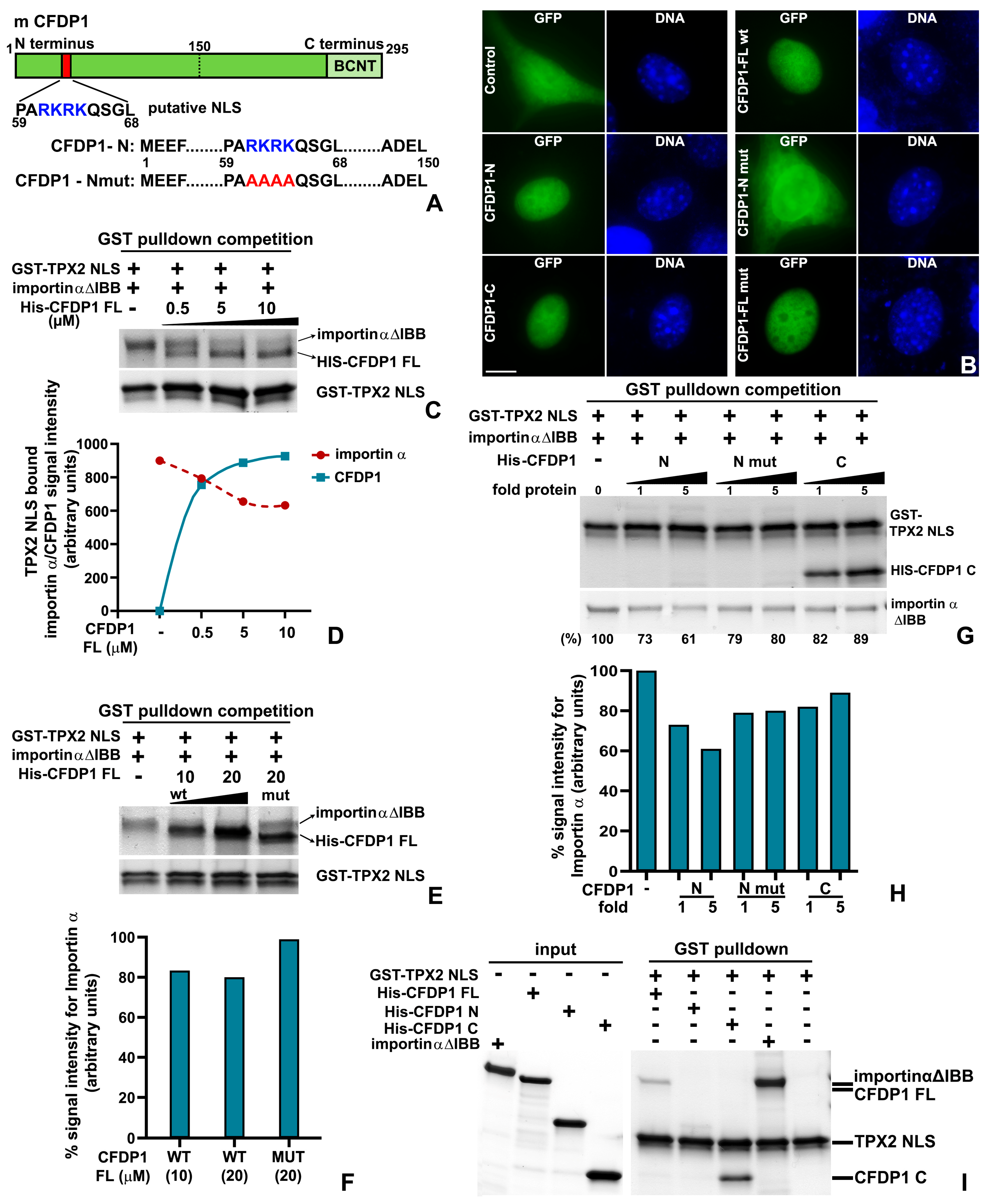 The acidic N terminus of CFDP1 harbors a monopartite NLS essential for importin α dissociation from TPX2. Sequestration of importin α by highly concentrated and localized nuclear localization signal (NLS)-containing proteins during mitosis has been suggested as a general mechanism for the activation of Spindle Assembly Factors (SAFs) such as TPX2 [