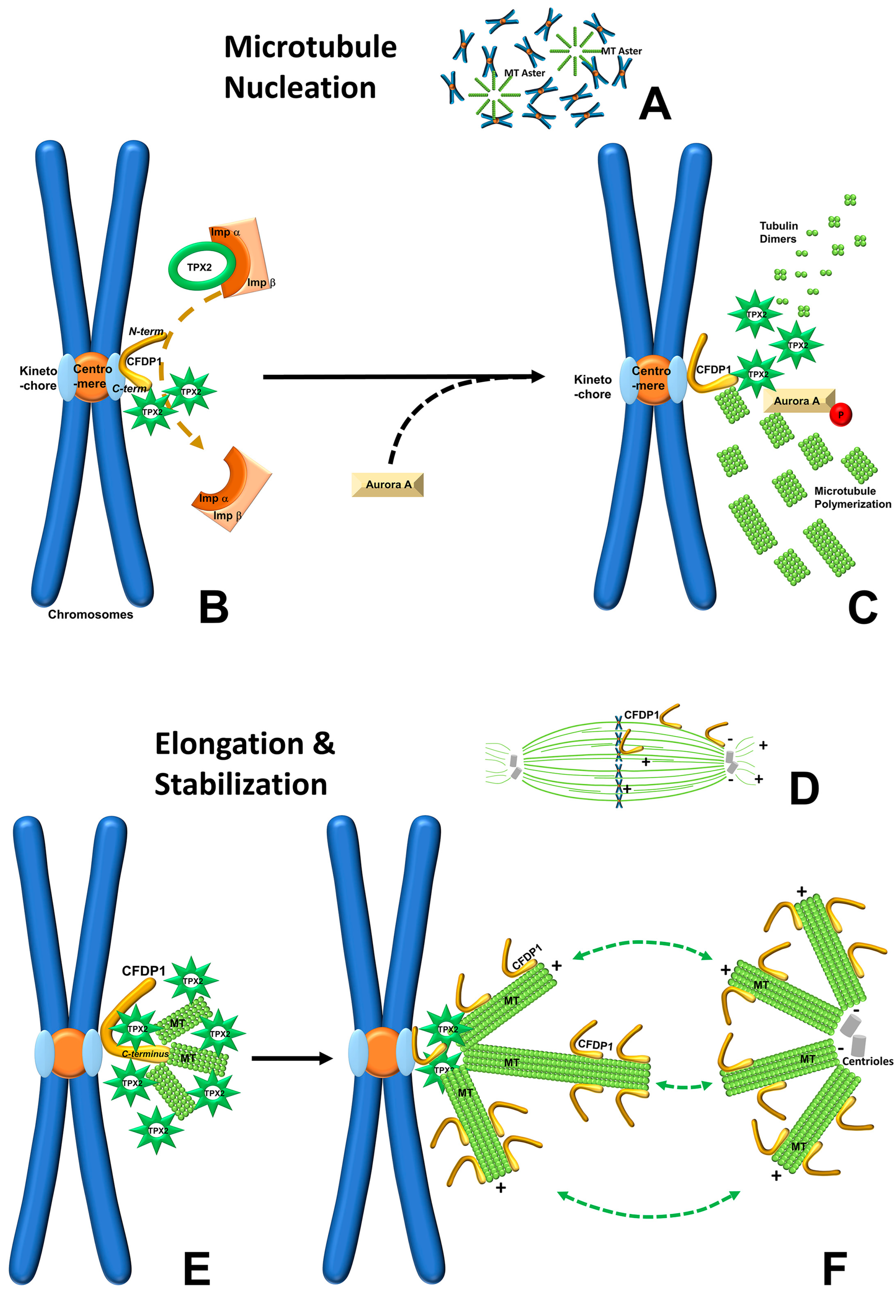 The second aspect by which CFDP1 functions during TPX2-mediated MT nucleation and assembly is the conserved TPX2-Aurora A pathway, regulating Aurora Kinase A activation by TPX2. Release of TPX2 from importin-α/β in the proximity of chromosomes in a RanGTP-mediated fashion allows TPX2 to interact with and activate Aurora A [