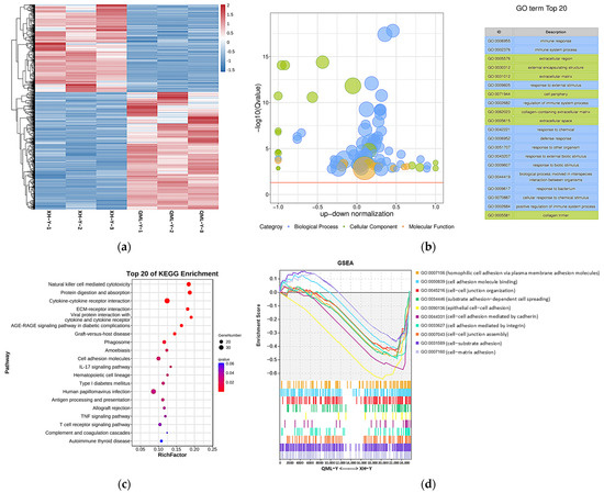 DEGs and their functional analysis results in high- and low-altitude yak lung tissues. (a) Clustering heatmap of DEGs, where red indicates upregulated genes and blue indicates downregulated genes; (b) GO enrichment results of DEGs. −log10(Q-value) on the y-axis indicates significance; the x-axis shows the proportion of upregulated (positive) and downregulated (negative) genes; GO categories: blue represents biological process, green represents cellular component, and orange represents molecular function; the yellow line marks the Q-value = 0.05 threshold; (c) KEGG enrichment bubble chart of DEGs, where dot size represents the number of genes enriched in each pathway, and redder color indicates smaller p-value (i.e., higher pathway significance); (d) GSEA results of adhesion-related GO terms. The x-axis indicates gene rank in the list, while the y-axis ‘Enrichment Score’ reflects the enrichment degree of each gene set (higher scores indicate more significant enrichment), with positive values representing activated states and negative values indicating suppressed states.