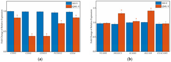 qRT-PCR revealed that the gene expression levels of five major CAMs categories differed (Figure 4). In the lung tissues of high-altitude yaks, the relative expression levels of genes associated with the cadherin family (CDH1, CDH2, CDH11, PCDH12, CD34), integrin family (ITGA3, ITGA5, ITGB6), selectin family (SELL), and other adhesion molecules (JAM3) were significantly lower than those in low-altitude yaks (p < 0.05), while genes of the immunoglobulin superfamily (SIGLEC1, ICAM3, ALCAM) showed adaptively upregulated expression (p < 0.05). Additionally, no significant differences were observed in the relative expression of some CAM-related genes (VCAM1, CEACAM1, ITGAV, SELPLG, CD44, ESAM) between altitude groups.