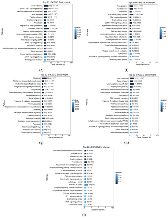 KEGG enrichment analysis results of cell adhesion-related subpopulations. (a) AEC II; (b) AEC I; (c) ciliated epithelial cells; (d) endothelial cells; (e) smooth muscle cells; (f) fibroblasts; (g) dendritic cells; (h) lymphatic endothelial cells; (i) basal cells.