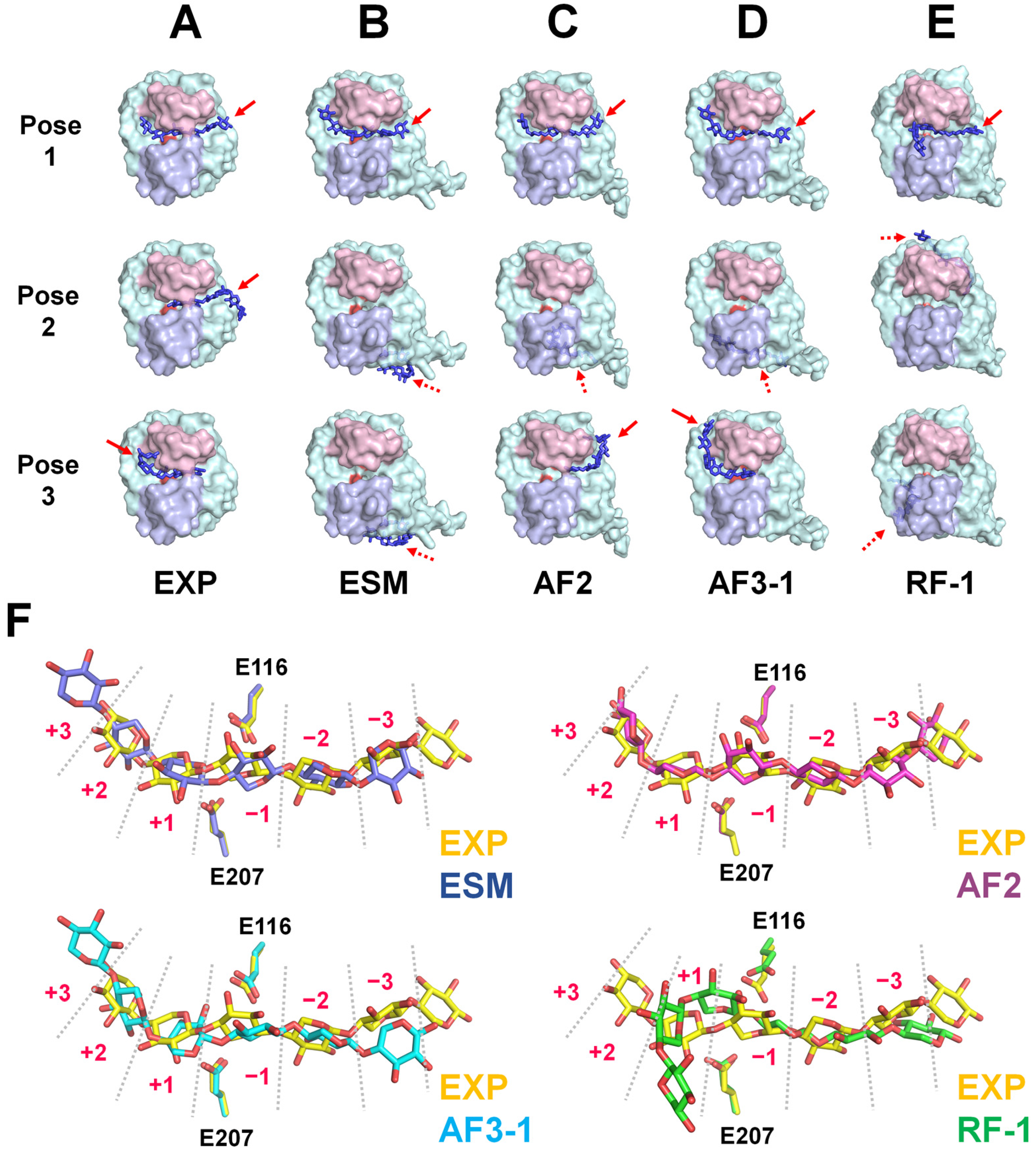 2.4. Docking of Xylohexaose to the Experimental and AI-Predicted Models of HviGH11