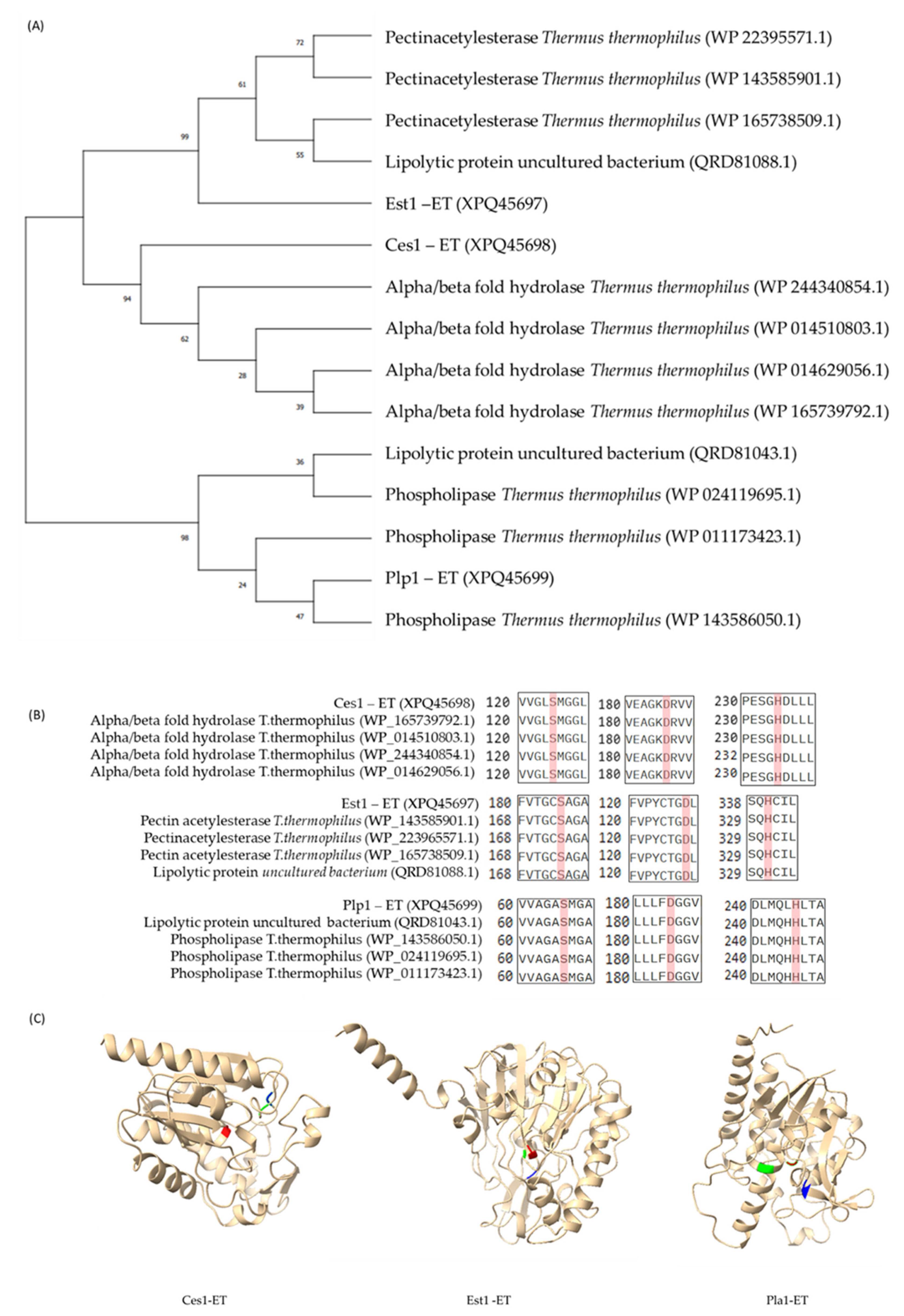 Overall, these results demonstrate that T. thermophilus ET-1 is a promising source of novel thermoenzymes and that the pTGT-1 system offers a flexible platform for the production and characterization of thermozymes. The combined thermostability, alkaline tolerance, and detergent compatibility of Ces1-ET, Est1-ET, and Plp1-ET underscore their relevance to industrial biotechnology and sustainable applications in the circular bioeconomy. Future work will focus on protein engineering to enhance catalytic efficiency, as well as evaluating their performance in polyester degradation and thermophilic bioreactor systems.
