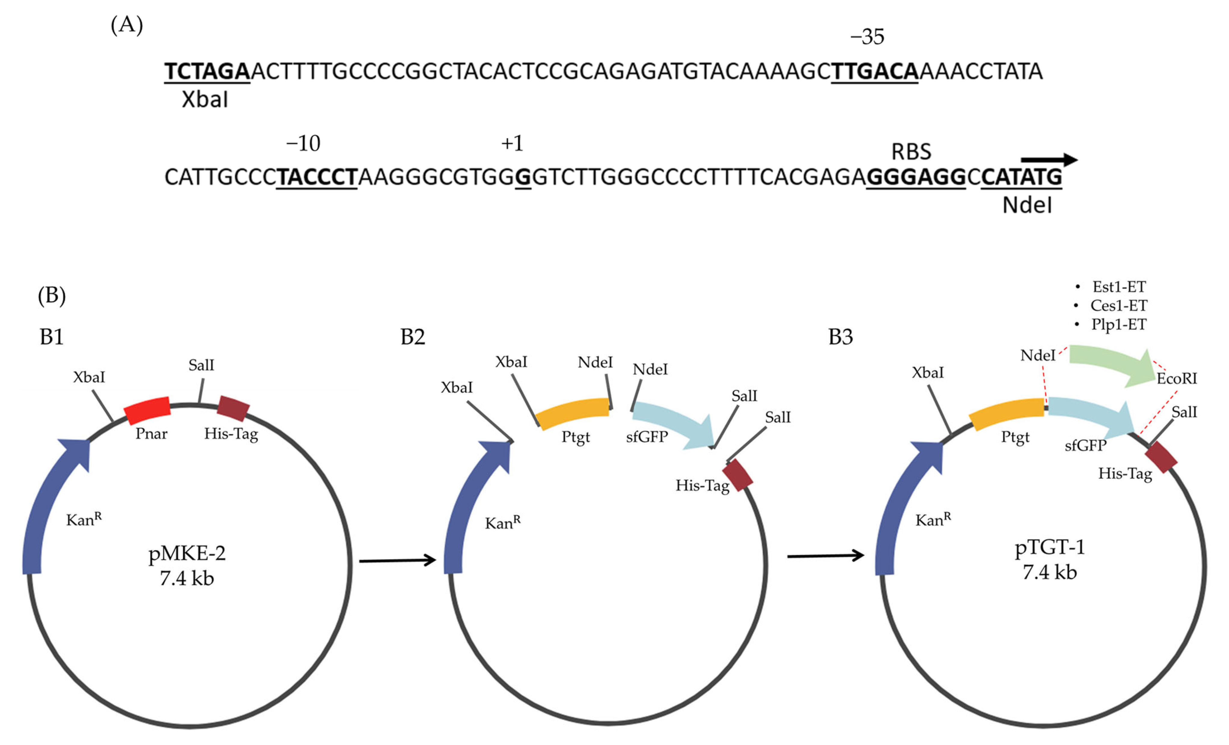 The subcloning of the three esterase sequences (Ces1-ET, Est1-ET, and Plp1-ET) into the pTGT-1 vector was carried out using NdeI and EcoRI sites, resulting in the subsequent constructs: pTGT1-Ces1, pTGT1-Est1, and pTGT1-Plp1, as illustrated in