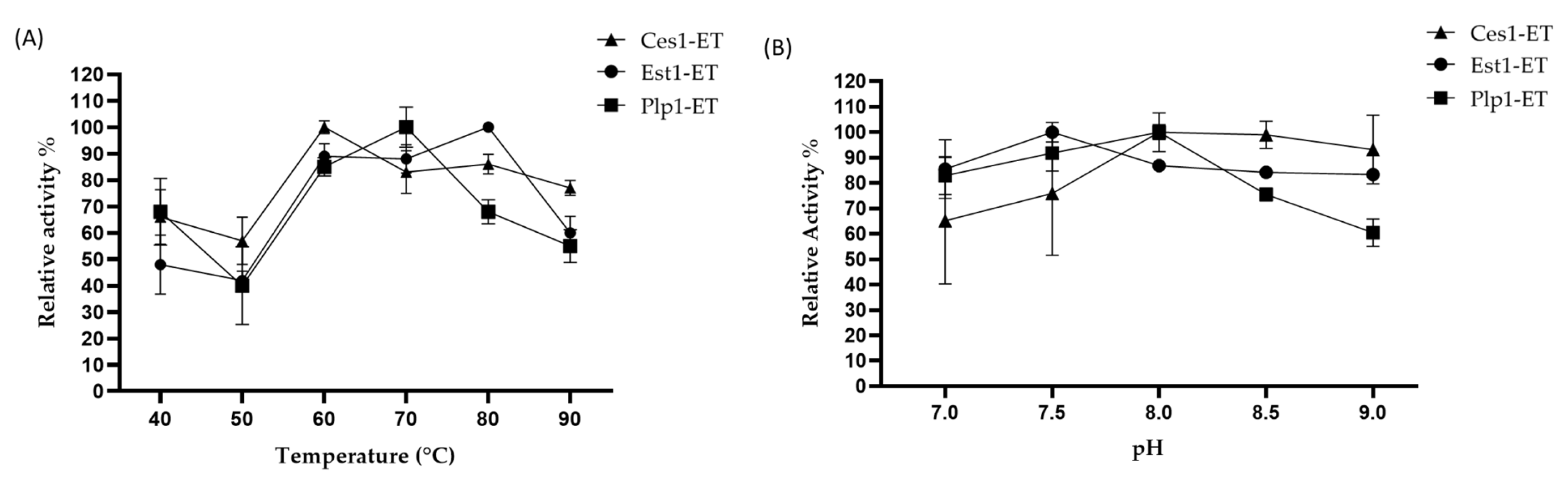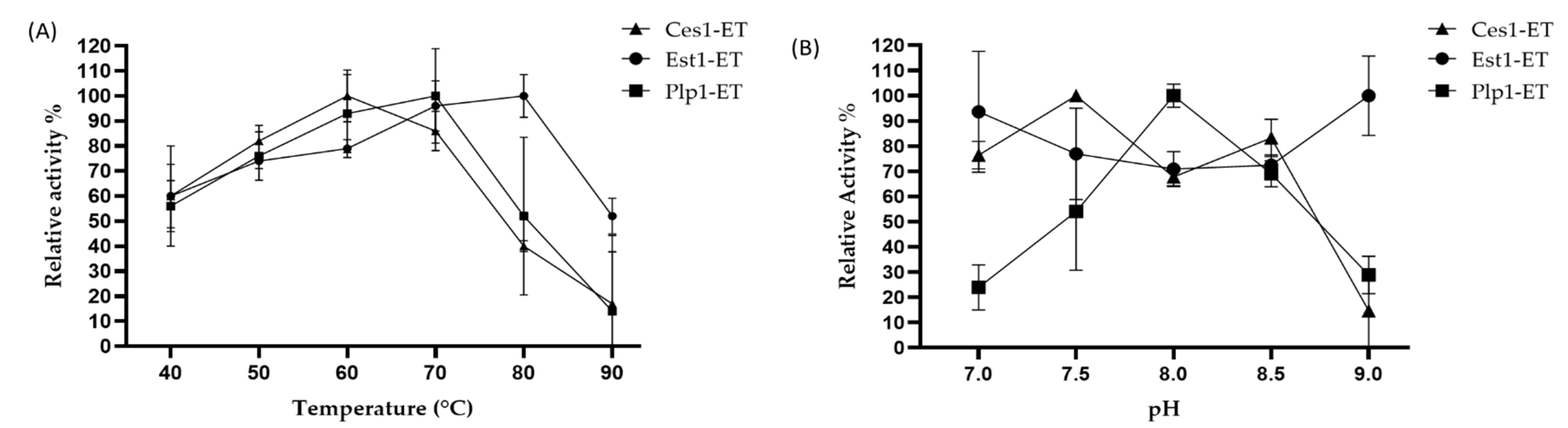 The pH dependency analysis of Ces1-ET exhibited more than 50% relative activity at pH between 7.0 and 8.5, reaching its optimal activity at approximately pH 7.5, Est1-ET revealed that the enzyme displays more than 50% relative activity within the pH range 7.0–9.0, with a maximum activity at pH 9.0. In contrast, Plp1-ET showed more than 50% relative activity between pH 7.5 and 8.5, with its highest activity at pH 8.0 (