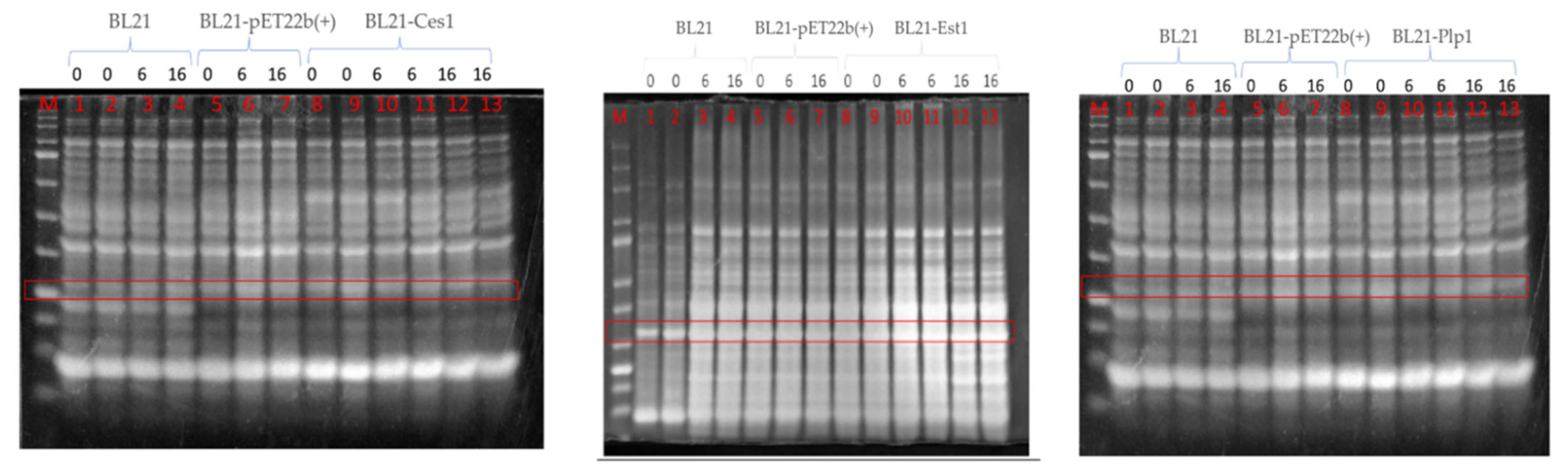 Figure 3A). Bands of the expected molecular masses were observed: 25 kDa for Ces1-ET, 36 kDa for Est1-ET, and 28 kDa for Plp1-ET. No detectable expression was observed using the pET22b(+) vector in