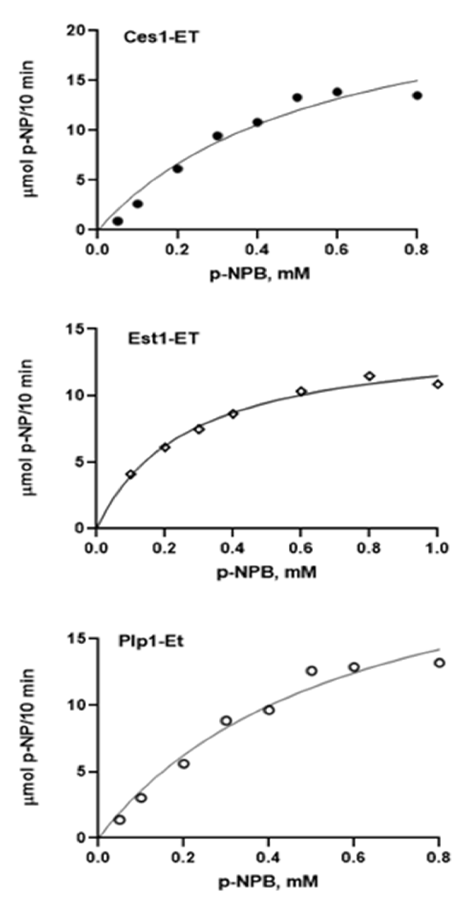 Km kinetic parameters of Ces1-ET, Est1-ET, and Plp1-ET were determined using