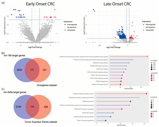 Differential expression analysis of ncRNAs in EO-CRC and LO-CRC. (a) Volcano plot of dysregulated ncRNAs in both groups. (b) Predicted hsa-miR-195 targets intersecting with tumor suppressor genes and their enriched pathways. (c) Predicted hsa-miR-549a targets intersecting with oncogenes and associated oncogenic pathways.